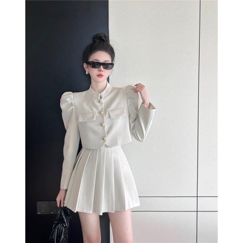 Set váy áo gồm áo tay dài cổ trụ cá tính và váy xếp ly lưng cao thời trang mùa thu 2022