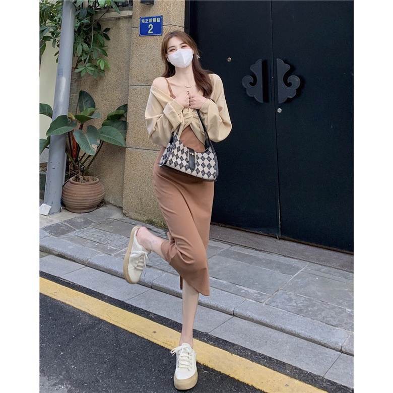 Set váy đầm hai dây kèm áo khoác chất đẹp phong cách Hàn Quốc MS4437