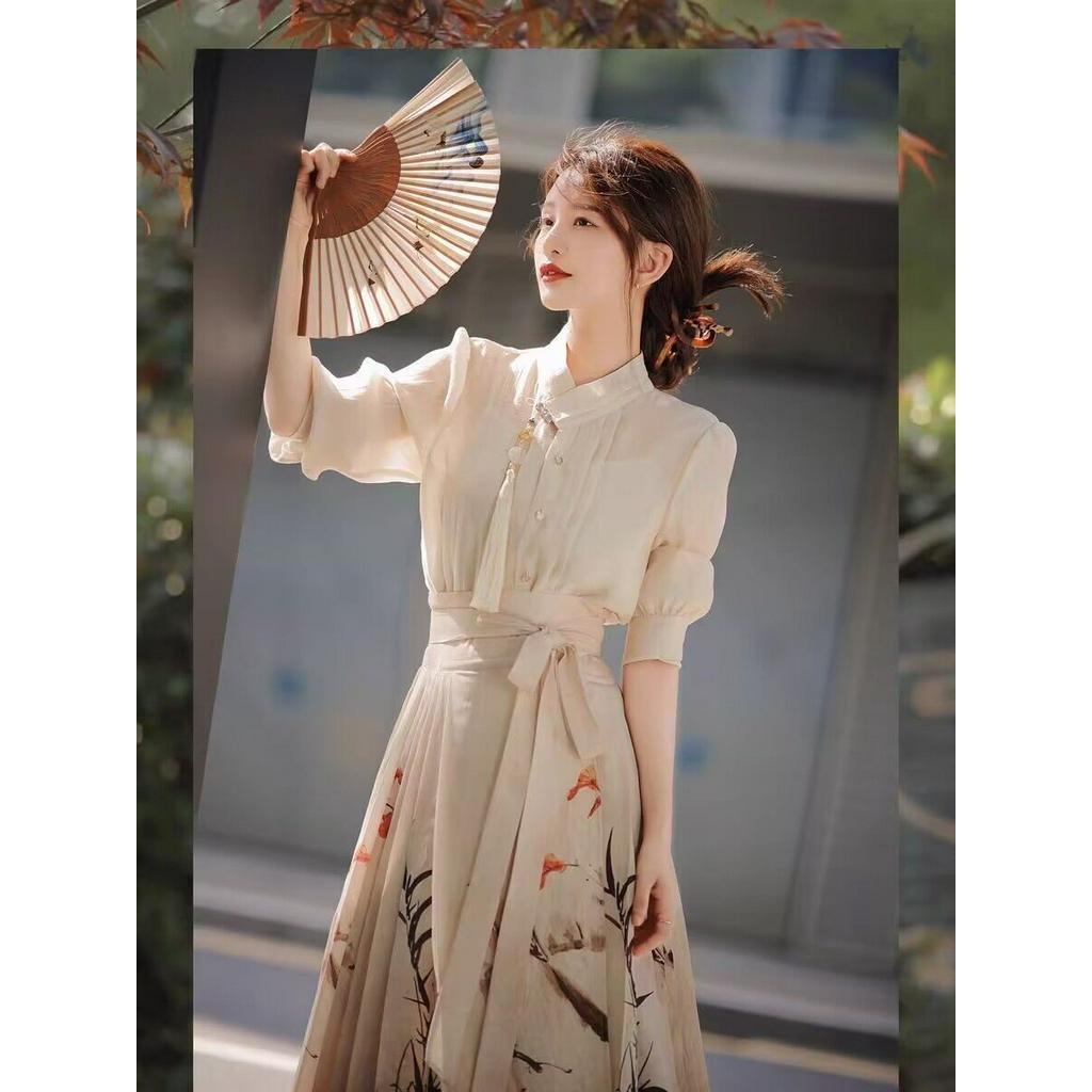 Set váy Tân Trung Hoa Quốc Phong Nữ Trang Cải Tiến Hán Phục cho Thiếu Nữ , váy áo nữ dáng sơ mi cao cấp
