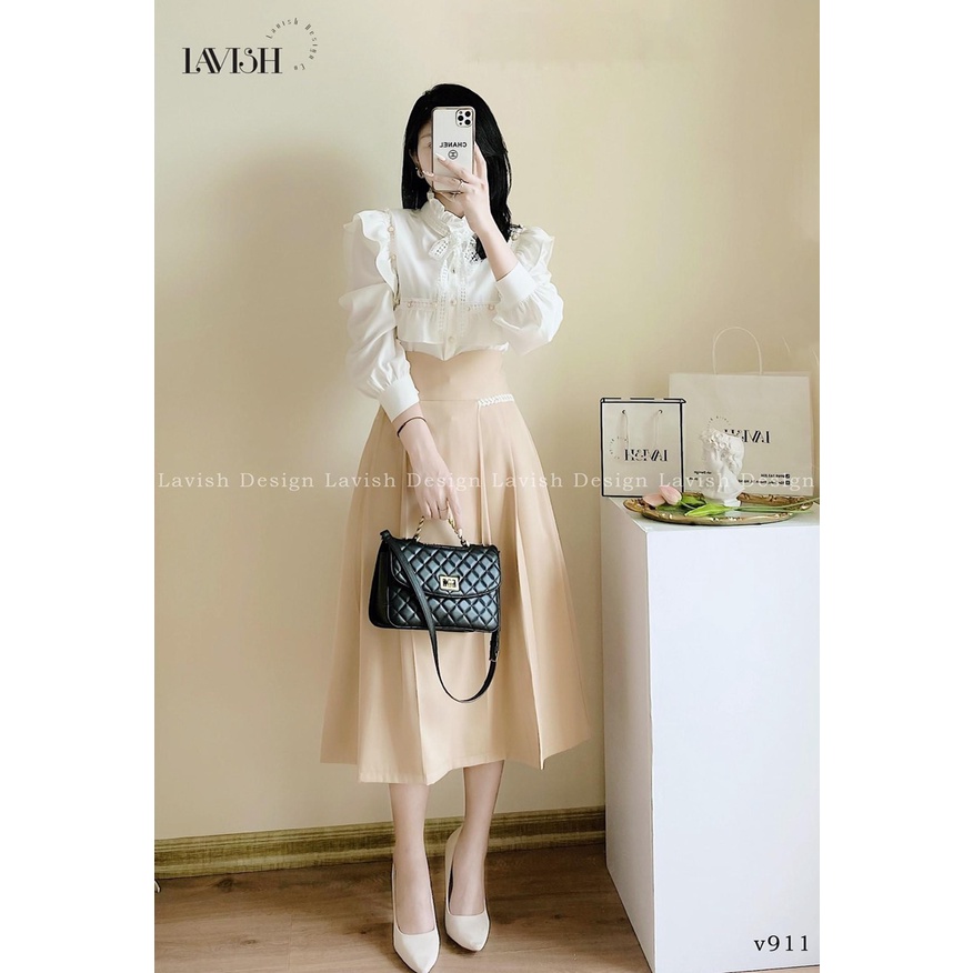 Set váy tiểu thư phối áo viền ren kèm chân váy chữ A, áo bèo cổ cách điệu kèm chân váy midi xếp ly