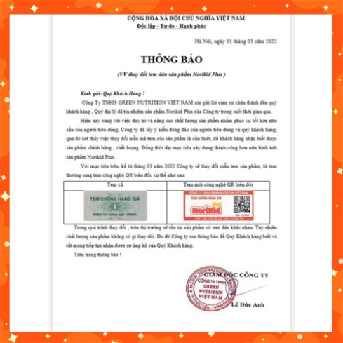 NORIKID PLUS – Hỗ Trợ Cải Thiện Biếng Ăn, Táo Bón, Tăng Sức Đề Kháng ở Trẻ 06 Tháng – 12 Tuổi (Hộp 20 Ống) Đại đa số trường hợp rối loạn tiêu hóa ở trẻ (Táo bón – Biếng Ăn – Tiêu Chảy – Đề Kháng Kém…) có 2 nguyên nhân: 1 là do thói quen cho trẻ ăn của bố mẹ (chiếm 14%) và 2 là sự thiếu hụt các lợi khuẩn đường ruột (chiếm những 86%). Vì thế, giải pháp thường xuyên được bác sỹ khuyên dùng là bổ sung trực tiếp lợi khuẩn cho đường ruột từ sản phẩm NORIKID PLUS. Đây là giải pháp an toàn không gây phụ thuộc, nhằm cân bằng lại hệ vi sinh đường ruột, cho hệ tiêu hóa của trẻ khỏe mạnh hơn. Sản phẩm được sản xuất bởi Công ty Cổ phần Dược phẩm OSHII và được phân phối bởi Công ty TNHH GREEN NUTRITION VIỆT NAM. Sản phẩm cũng được Bộ Y tế cấp phép lưu hành số 9556/2020/ĐKSP --------------------------------------- 🌈🌈QUY CÁCH ĐÓNG GÓI - Hộp 20 ống. - 4 vỉ x 5 ống. - Mỗi ống 10ml. --------------------------------------- 🌈🌈CÔNG DỤNG Norikid Plus có công dụng trên hệ tiêu hóa của trẻ: •Giúp phục hồi đường ruột,cải thiện hệ tiêu hóa. •Bổ sung lợi khuẩn giúp hấp thu dinh dưỡng. •Hỗ trợ điều trị biếng ăn,chậm lớn ở trẻ nhỏ. •Hỗ trợ thải độc đường ruột,thải độc cơ thể. •Hỗ trợ điều trị táo bón,tiêu chảy nhanh chóng. --------------------------------------- 🌈🌈Sản phẩm này không phải là thuốc, không có tác dụng thay thế thuốc chữa bệnh •Hỗ trợ tăng cường sức đề kháng cấp tốc. --------------------------------------- 🌈🌈ƯU ĐIỂM CỦA NORIKID PLUS •Norikid Plus được sản xuất theo công nghê đạt chuẩn Nhật Bản. •Chứa trên 3 tỷ bào tử lợi khuẩn Bacillus clausii, Bacillus subtilis, Bacillus coagulans kích thích hệ tiêu hóa của trẻ, phát triển xương toàn diện,cải thiện khả năng miễn dịch giúp tăng cường sức đề kháng cho trẻ. •Hàm lượng chất xơ Inulin cao, Norikid Plus giúp trẻ đi tiêu dễ dàng hơn. •Có Cao men bia, Yến sào tinh khiết giàu axit amin, thơm ngon, kích thích sự thèm ăn của trẻ. •Với Norikid Plus, trẻ không chỉ ăn ngon, hết táo bón mà còn phát triển toàn diện chiều cao, trí tuệ nhờ thành phần Canxi được chiết xuất từ tảo biển đỏ Aquamin F Nhật Bản, D3, Vitamin A và K2. •Cực kỳ dễ uống nhờ hương vị thơm ngon. •Sản phẩm đã được Bộ Y tế, Cục an toàn thực phẩm chứng nhận. --------------------------------------- 🌈🌈ĐỐI TƯỢNG SỬ DỤNG NORIKID PLUS - NORIKID PLUS an toàn cho trẻ từ 06 tháng – 12 tuổi. - Trẻ biếng ăn, táo bón, hệ tiêu hóa kém, gầy yếu, còi xương, suy dinh dưỡng. - Hoàn toàn không có tác dụng phụ và phụ thuộc. --------------------------------------- 🌈🌈HƯỚNG DẪN SỬ DỤNG NORIKID PLUS Từ 06 tháng – dưới 1 tuổi : Uống 10ml/lần x 1-2 lần/ngày. Từ 1 – 4 tuổi : Uống 10ml/lần x 2 lần/ngày. Từ 4 – 8 tuổi : Uống 10ml/lần x 3 lần/ngày. Từ 9 tuổi trở lên : Uống 10ml/lần x 2-3 lần/ngày. Để mang lại hiệu quả tốt nhất, nên sử dụng 1 liệu trình liên tục tối thiểu 3 hộp. Sản phẩm không gây tác dụng phụ và phụ thuộc nên có thể sử dụng liên tục nếu bé đang cần bổ sung tăng sức đề kháng và cải thiện cân nặng. ☎️ ☎️ : 0901424241