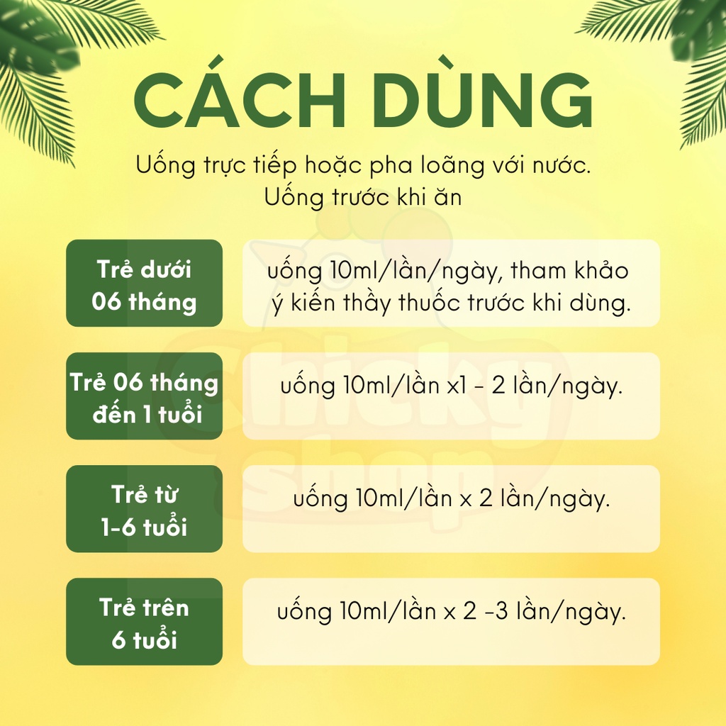 Siro ăn ngon MINION HAPPY (30 Gói/300mL) hỗ trợ tiêu hóa tốt, cải thiện chiều cao cân nặng cho trẻ THÔNG TIN SẢN PHẨM + Đóng gói : 30 gói/ Hộp + Thể tích thức: 300ml THÀNH PHẦN + Taurine: 20mg + Canxi gluconat: 50mg + Orafti p95 (Oligofructose-POS): 200mg + L-Lysine HCL : 350mg + L-Arginine L-aspartate: 100mg + Springer 0203 :200mg digezyme: 40mg (Tương đương Amylase 900UL protese 240UL lastase 160UL,cellulase 44UL, lipase 8UL ) + Kẽm gluconate : 20mg + Vitamin E : 5mg + Vitamin B6: 5mg + Vitamin D3 + DHA 11%: 5mg HƯỚNG DẪN SỬ DỤNG Trẻ 1-3 tuổi: 10ml/1 lần x 1 lần / ngày Trẻ 3-7 tuổi 10ml/1 lần x 2 lần /1 ngày Trẻ 7-12 tuổi 10ml/1 lần x 3 lần /1 ngày Trẻ từ 12 tuổi trở lên 10ml/1 lần x 3 lần -4 lần / 1 ngày Nên dùng thành đợt tối thiểu để đạt hiệu quả tốt nhất. Lắc đều trước khi sử dụng. Sản phẩm này không phải là thuốc và không có tác dụng thay thế thuốc chữa bệnh #Siroanngon #minion_happy #biengan #drmaya #chickyshop #chicky_shop2021