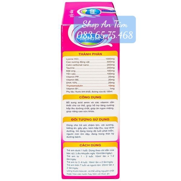 NGUYÊN LIỆU NHẬP KHẨU TỪ MỸ NHÃN HIỆU ĐƯỢC BÁC SỸ KHUYÊN DÙNG Thành phần của Alphavit : Lysin: 10000mg Mật ong: 100mg Taurine: 200mg Cao xương động vật: 500mg Calci nano: 5000mg DHA: 20mg Beta glucan: 10mg Vitamin B1: 1mg Vitamin B2: 1mg Vitamin B5: 20mg Vitamin PP: 25mg Thành phần khác vừa đủ 100ml. Công dụng của Alphavit : - Alphavit Ăn Ngon - Ngủ Tốt bổ sung acid amin, vitamin và các khoáng chất cần thiết giúp kích thích ăn ngon, tăng cường hấp thu dưỡng chất, đặc biệt ở trẻ còi xương, suy dinh dưỡng, biếng ăn, trẻ hay ốm vặt, gầy yếu. - Giúp tăng cường phát triển trí tuệ và thể chất ở trẻ em. Liều dùng - Cách dùng : - Trẻ dưới 1 tuổi: tham khảo ý kiến Bác sĩ. - Trẻ 1 - 6 tuổi: 1 ống/lần, 1 - 2 lần/ngày. - Trẻ 6 - 9 tuổi: 1 ống/lần, 2 - 3 lần/ngày. - Trẻ trên 9 tuổi và người lớn: 2 ống/lần, ngày 2 - 3 lần. Đối tượng sử dụng : Alphavit Ăn Ngon - Ngủ Tốt dùng trong các trường hợp: - Trẻ em bị suy dinh dưỡng, biếng ăn, chậm lớn, còi xương, gầy yếu, kém hấp thu. - Trẻ đang trong giai đoạn phát triển, chậm phát triển về chiều cao, chậm mọc răng. Tác dụng phụ : - Chưa có báo cáo về tác dụng phụ của sản phẩm. Lưu ý : - Sản phẩm này không phải là thuốc và không có tác dụng thay thế thuốc chữa bệnh. - Đọc kỹ hướng dẫn trước khi sử dụng. Bảo quản : - Bảo quản nơi khô ráo, thoáng mát, tránh ánh sáng, nhiệt độ dưới 30 độ C. Quy cách : - Hộp 4 vỉ x 5 ống Nhà sản xuất : - CTY CP DƯỢC PHẨM QUỐC TẾ USA Nước sản xuất : - VIET NAM MẸO ĐẶT HÀNG : - Khu vực nội thành Hà Nội – bạn nên chọn NOWSHIP | GRAB để nhận hàng hỏa tốc trong 1-2 giờ nhé (Buổi tối thì nên Chat hoặc gọi Shop trước để Shop ktra đơn đc nhanh hơn) - Khu vực các tỉnh nên chọn GHTK để đơn được giao nhanh hơn - Chon thêm mã 𝗙𝗿𝗲𝗲𝘀𝗵𝗶𝗽 𝗘𝘅𝘁𝗿𝗮 trong mục "Shopee Voucher" để được hỗ trợ ship từ 20k tới 70k - Thêm mã Hoàn xu để khi đơn hàng thành công, bạn được tặng thêm Shopee xu đấy ^^ Bạn cần tư vấn gì thêm thì cứ Chat hoặc gọi Hotline cho shop nha 24/7 #anngon #antamstore #antamshop #antamstore #antamshop #antamcare