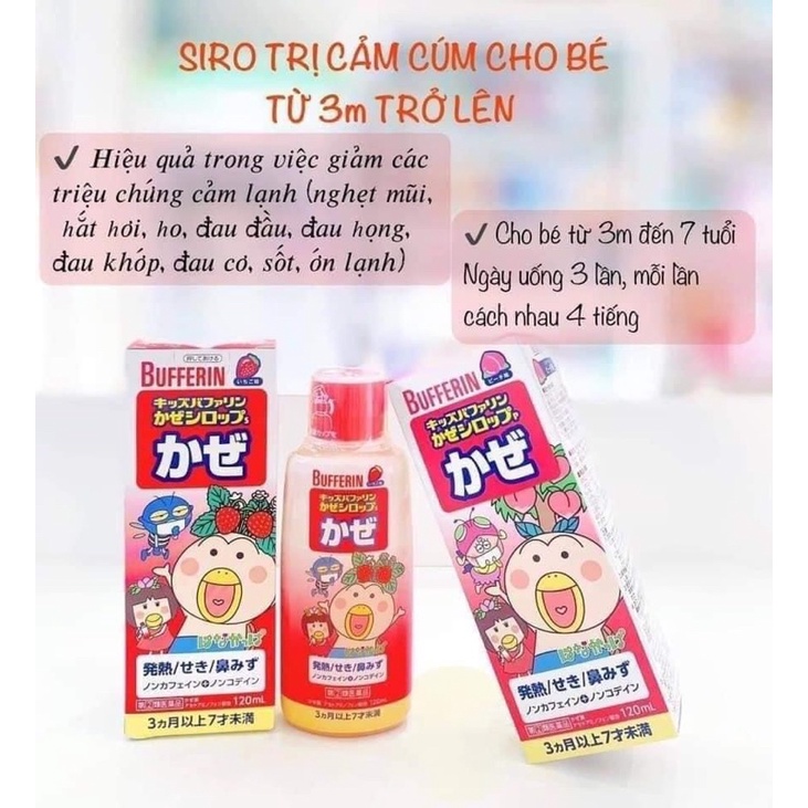Siro thảo dược Bufferin Nhật Bản Thành phần: Thảo dược, không chứa CAFFEINE, CODEINE, an toàn cho trẻ nhỏ tuyệt đối. Xuất xứ: Nhật Bản Thương hiệu: Bufferin Dung tích: 120ml Mã vạch: - 4903301233619: Xanh dương - 4903301233565: Đỏ - 4903301233633: Xanh lá - 4903301233596: Hồng - 4903301233558: Cam 1. Công dụng: - Giảm ho và long đờm nhanh chóng. Hạ sốt hiệu quả. - Cải thiện các biểu hiện khó chịu của bệnh cảm lạnh, viêm họng. - Xóa tan cơn đau đầu, nghẹt mũi, hắt hơi, đau họng và đau nhức cơ. - Nâng cao sức đề kháng cho trẻ 2. Công dụng/ phân loại: - Siro Bufferin MÀU HỒNG vị đào (3 tháng – 7 tuổi): chữa sốt, cảm cúm, ho khan và sổ mũi, rát họng. - Siro Bufferin MÀU CAM vị dâu (3 tháng – 7 tuổi): giảm triệu chứng cảm lạnh, sốt. - Siro Bufferin MÀU XANH DƯƠNG vị dâu (3 tháng – 8 tuổi): chữa ho có đờm. - Siro Bufferin MÀU XANH LÁ vị dâu (3 tháng – 11 tuổi): chữa sổ mũi hay nghẹt mũi. - Siro Bufferin MÀU ĐỎ vị dâu (3 tháng - 7 tuổi): chữa cảm cúm 3. Cách dùng chung: (VÌ KHÁC ĐỘ TUỔI NÊN MỖI LOẠI CHÊNH NHAU NHIỀU ÍT QUA TỪNG LOẠI, IBOX E TƯ VẤN KỸ HƠN Ạ) - Từ 5 đến 8 tuổi; 10ml/ lần - Từ 3 đến dưới 5 tuổi: 7.5ml / lần - Từ 1 đến dưới 3 tuổi: 6ml / lần - Từ 3 tháng đến dưới 1 tuổi: 3 ml / lần Ngày 3 lần, uống sau bữa ăn, cách nhau giữa 2 lần uống không dưới 4h, không quá 6 lần/ ngày. ------------------------------------------- Sản phẩm này không phải là thuốc không có chức năng thay thế thuốc chữa bệnh. #siro #thao #duoc #bufferin #nhat #ban #120ml #cho #be