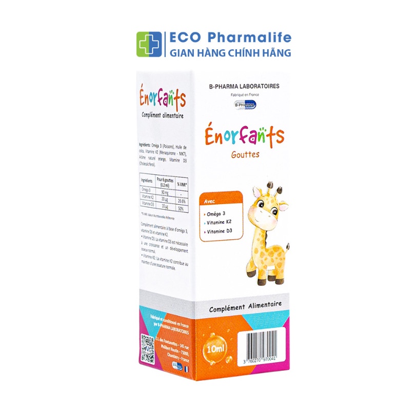 THÔNG TIN SẢN PHẨM Siro Énorfants bổ sung D3K2 và omega-3 cho bé xương răng chắc khỏe, phát triển IQ - Thương hiệu: ÉNORFANTS - Xuất xứ: Pháp ĐẶC ĐIỂM NỔI BẬT Siro Énorfants bổ sung D3K2 và omega-3 cho bé xương răng chắc khỏe, phát triển IQ - Hàm lượng Omega3 cao nhất đảm bảo đủ cho phát huy tác dụng tốt nhất hiệu quả hỗ trợ sự phát triển trí não. Việc cung cấp đầy đủ Omega 3 cho trẻ em sẽ có kỹ năng phối hợp tay và mắt tốt. Đồng thời, chúng cũng có tác dụng tăng kỹ năng xã hội, khả năng tập trung và chỉ số IQ cao hơn.Cải thiện thị lực, bảo vệ mắt của trẻ. - Hàm lượng vitamin D3 và K2 vừa đủ trong thành phần giúp hỗ trợ hấp thụ canxi tự nhiên. Phần lớn trẻ em thiếu canxi do trẻ thiếu vitamin D3 và K2 làm khó hấp thu canxi từ thức ăn, việc bổ sung các vitamin này là vô cùng cần thiết đối với sự phát triển của trẻ. CÔNG DỤNG Siro Énorfants bổ sung D3K2 và omega-3 cho bé xương răng chắc khỏe, phát triển IQ Bổ sung omega-3, vitamin D3 và vitamin K2 cho cơ thể. Hỗ trợ tăng khả năng hấp thu canxi, giúp hệ xương và răng phát triển, giúp giảm nguy cơ còi xương ở trẻ nhỏ. CHÚ Ý : Sản phẩm không phải là thuốc, không có tác dụng thay thế thuốc chữa bệnh. THÀNH PHẦN Siro Énorfants bổ sung D3K2 và omega-3 cho bé xương răng chắc khỏe, phát triển IQ Trong 0,2 ml (tương đương 6 giọt) chứa: - Vitamin D3: 10 mcg - Vitamin K2: 20 mcg - Omega-3: 90 mg - Phụ liệu vừa đủ. ĐỐI TƯỢNG SỬ DỤNG Siro Énorfants bổ sung D3K2 và omega-3 cho bé xương răng chắc khỏe, phát triển IQ Trẻ sơ sinh và trẻ nhỏ chậm phát triển, còi xương, chậm mọc răng, những người có nhu cầu Vitamin D3 và K2. HƯỚNG DẪN SỬ DỤNG Siro Énorfants bổ sung D3K2 và omega-3 cho bé xương răng chắc khỏe, phát triển IQ Lắc kỹ trước khi sử dụng Trẻ em từ 0-6 tháng: 3 giọt mỗi ngày hoặc tham khảo ý kiến của chuyên gia y tế Trẻ em từ 6-12 tháng: 6 giọt mỗi ngày hoặc tham khảo ý kiến của chuyên gia y tế Trẻ em từ 1-3 tuổi: 6-9 giọt mỗi ngày Trẻ em từ 3 tuổi trở lên: 9-12 giọt mỗi ngày. HƯỚNG DẪN BẢO QUẢN Siro Énorfants bổ sung D3K2 và omega-3 cho bé xương răng chắc khỏe, phát triển IQ Bảo quản nơi khô ráo, thoáng mát, tránh ánh sáng #vitamin #d3 #k2 #loang #xuong #suy #dinh #duong #phat #trien #chieu #cao #tre #c #giup #chac #khoe #rang #ecopharmalife