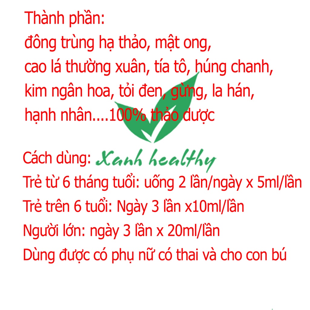 Siro Đông Trùng Bổ Phổi- Giúp Bổ Phổi, Nhuận Phế, Giảm Ho, Giảm Đờm,Rát Họng, Khàn Tiếng, Tăng Cường Sức Khỏe,Tăng Miễn Dịch Cho Cơ Thể- Chai 100ml Siro Đông Trùng Bổ Phế giảm ho, giảm đờm, giảm đau rát cổ họng cho bé từ 1 tuổi - Chai 100ml Được Bộ Y Tế cấp phép sản xuất Sản xuất đạt chuẩn GMP Bộ Y Tế Thành phần dược liệu thiên nhiên: thiên môn, kha tử, lá thường xuân, húng chanh, kim ngân hoa. đông trùng hạ thảo Hỗ trở bổ phế, giảm ho, giảm đờm Giảm đau rát họng, khản tiếng do ho kéo dài Siro Thần Cường Phế Tỏi Đen Sử dụng cho trẻ em từ 1 tuổi và người lớn Công dụng Của Siro Đông Trùng Bổ Phế - Hỗ trợ giảm ho, bổ phế.hỗ trợ giảm các triệu chứng do viêm họng, viêm phế quản - Giảm tình trạng đau rát họng, khản tiếng do ho kéo dài. - Hỗ trợ tăng sức đề kháng,bảo vệ sức khỏe đường hô hấp - Sử dụng cho bé từ 1 tuổi và người lớn HƯỚNG DẪN SỬ DỤNG - Trẻ emtừ 1 đến 3 tuổi : 5ml / lần, 1 đến 2 lần / ngày (Nên hỏi ý kiến bác sĩ, dược sĩ trước khi dùng). - Trẻ em từ 3 - 10 tuổi: 10ml / lần, ngày 2 lần. - Trẻ em trên 10 tuổi và người lớn: 10ml - 15ml / lần, ngày 2 đến 3 lần. SHOP CAM KẾT - Tư vấn mọi vấn đề liên quan đến sản phẩm hoặc sức khoẻ của khách hàng miễn phí thông qua số điện thoại, email có trên phiếu giao hàng - Tất cả các sản phẩm ngành hàng sức khoẻ và sắc đẹp được bán đều còn nguyên chất lượng như vừa mới sản xuất ít nhất 2 năm nữa. - Tất cả các sản phẩm liên quan đến sức khoẻ, sắc đẹp đều có đăng ký và kiểm nghiệm định kỳ với bộ y tế. NHẬN BIẾT SẢN PHẨM CHÍNH HÃNG Hiện nay trước tình hình hàng hóa thật giả lẫn lộn, không rõ nguồn gốc xuất xứ trà trộn nên sản phẩm của Shop thường có 1 số dấu hiệu nhận diện sau, các bạn nên lưu ý để mua đúng hàng chính hãng của công ty nhé: Trên vỏ hộp có số công bố đăng ký với bộ y tế. Địa chỉ nhà máy sản xuất in trên vỏ hộp. Lô sản xuất, ngày sản xuất, hạn sử dụng in trên vỏ hộp. Nhiều sản phẩm có thêm mã sản phẩm in trên vỏ hộp. Mua tại XANH Healthy để nhận hàng chính hãng Sản phẩm không phải là thuốc không có tác dụng thay thế thuốc chữa bệnh