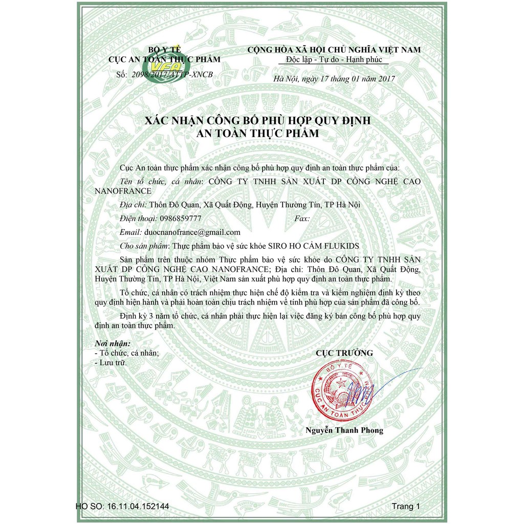 1. THÀNH PHẦN SIRO HO CẢM FLUKIDS Nhất Dược: Cho 100ml: - Mật ong................................2500mg - Cao khô lá thường xuân......1000mg 169mg cao đặc hỗn hợp tương đương: + Gừng....................................1650mg + Húng chanh..........................45mg - Dầu bạc hà.............................8mg - Dầu tràm.................................9mg Phụ liệu: đường kính, nước, natri benzoat, sorbat kali, xanhthagum, vừa đủ 1 lọ 2. CÔNG DỤNG SIRO HO CẢM FLUKIDS Nhất Dược: - Hỗ trợ bổ phế, giảm ho, giảm đờm, giảm đau họng, rát họng, khản tiếng do v.iêm họng, ho kéo dài. 3. ĐỐI TƯỢNG SỬ DỤNG SIRO HO CẢM FLUKIDS Nhất Dược - Trẻ em từ 1 tuổi bị ho, ho khan, ho có đờm, ho do v.iêm họng, v.iêm phế quản, thay đổi thời tiết. Trẻ bị khản tiếng, rát họng do ho kéo dài. 4. CÁCH DÙNG SIRO HO CẢM FLUKIDS Nhất Dược - Trẻ từ 1-6 tuổi: Ngày uống 2 lần, mỗi lần 5-10ml - Trẻ từ 7-12 tuổi: Ngày uống 2-3 lần, mỗi lần 10ml - Trẻ em trên 12 tuổi: Ngày uống 2-3 lần, mỗi lần 20ml Chú ý: Lắc trước khi uống, uống trực tiếp hoặc pha loãng với nước s.ôi để nguội, uống trước hoặc sau bữa ăn khoảng 1-2h là tốt nhất. 5. QUY CÁCH ĐÓNG GÓI: Hộp 1 lọ x 120ml 6. LƯU Ý: Thực phẩm này không phải là thuốc và không có tác dụng thay thế thuốc chữa bệnh.