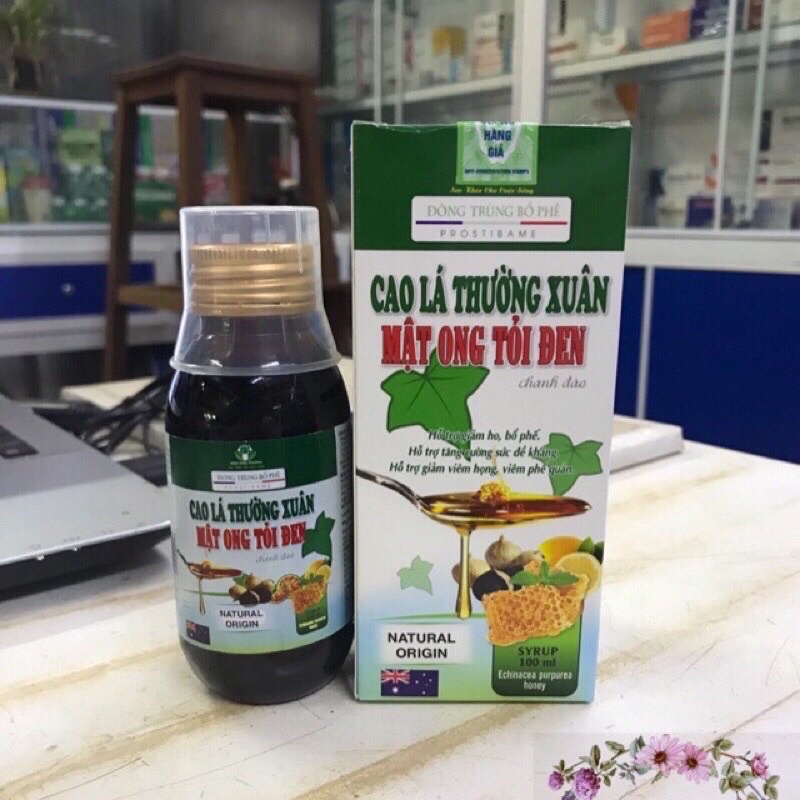 Cao lá Thường xuân Tỏi đen Mật ong Thành phần: mật ong, chiết xuất hoa cúc tím, cao lá thường xuân, thymomodulin, bromelain, đông trùng hạ thảo, chanh đào, tỏi đen, bạc hà, kim ngân hoa, lá trầu không, hẹ, quả tầm bóp, quất, cam thảo, gừng gió, húng chanh, hạnh nhân,