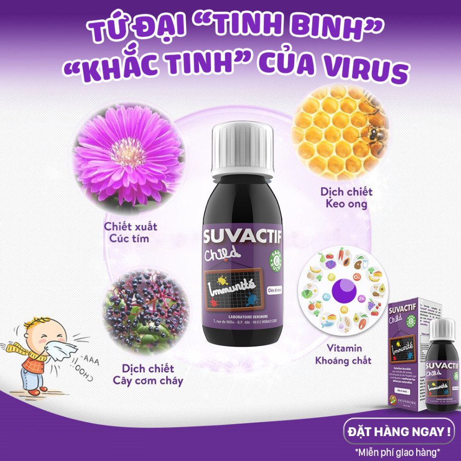 Siro tăng sức đề kháng SUVACTIF IIMMUNITÉ giúp tăng cường hệ miễn dịch tự nhiên của cơ thể, nâng cao sức đề kháng cho trẻ, hỗ trợ sức khỏe đường hô hấp, giúp phòng ngừa và làm giảm nguy cơ mắc các vấn đề về đường hô hấp cho bé. ✅THÀNH PHẦN: Nước, Glycerin, Chiết xuất glycerin của Propolis (Keo ong), Chiết xuất cây cúc tím Echinacea (Echinacea purpurea L.), Chiết xuất cây cơm cháy Sureau (Sambucus nigra L), Guar gum, Vitamin C, Kẽm citrate, Đồng bisglycinate, Sucralose, Vitamin D3, Vitamin B12. - Dịch chiết cây cơm cháy: chống viêm, giảm đau, chống virus, cải thiện chức năng của đường hô hấp trên, tăng cường sức đề kháng tự nhiên. - Dịch chiết cây Cúc tím: giảm trung bình 58% nguy cơ mắc cảm và thời gian mắc cảm cũng giảm đi bình quân 1,5 ngày so với người không sử dụng, giảm được 35% nguy cơ mắc virus, tăng cường chức năng miễn dịch. - Dịch chiết Keo ong: chống vi khuẩn. - Cu: Thúc đẩy sự hấp thu và sử dụng sắt để tạo thành Hemoglobin của hồng cầu. - Zn: Phát triển và duy trì hoạt động hiệu quả của hệ thống miễn dịch, giúp bảo vệ vị giác và khứu giác. - Vitamin C: Hỗ trợ tăng cường hấp thu sắt cho cơ thể, tham gia vào quá trình chuyển hóa sản sinh năng lượng bình thường của cơ thể, tăng cường miễn dịch. Chất bảo quản: Potassium sorbate, Sodium benzoate, an toàn cho sức khỏe, không gây tác dụng phụ. ✅ĐỐI TƯỢNG - Trẻ hay ốm, hay mắc các vấn đề về đường hô hấp. - Trẻ hay mắc cảm cúm, ho, viêm mũi họng do thay đổi thời tiết, hay tái phát nhiều lần. - Trẻ gầy yếu, biếng ăn, kém hấp thu, suy dinh dưỡng, chậm phát triển. - Dùng được cho trẻ từ 6 tháng tuổi. ✅HƯỚNG DẪN SỬ DỤNG Lắc kỹ lọ trước khi sử dụng Trẻ dưới 6 tuổi: 10 ml một lần, ngày một lần sau ăn. Trẻ trên 6 tuổi: 20 ml một lần, ngày một lần sau ăn. Nên dùng duy trì liên tục từ 1 – 2 tháng để có hiệu quả tối ưu ✅ MẸ BẦU SỐNG XANH - NPP ĐỘC QUYỀN TẠI VIỆT NAM - CAM KẾT CHẤT LƯỢNG 100% - Chat khách 24/24_Dược sĩ chuyên môn trực tiếp tư vấn - Hoàn tiền 100% nếu sản phẩm không giống hình, hàng lỗi hoặc giao thiếu hàng. - Có hóa đơn VAT đầy đủ ✅CHÍNH SÁCH ĐỔI TRẢ: - Đổi trả trong vòng 3 ngày sau khi nhận hàng - Sản phẩm lỗi, hư hỏng trong quá trình vận chuyển được đổi mới - Lưu ý: Khách hàng cần quay video khui hàng để gửi khiếu nại để nhãn hàng có căn cứ xử lý nhanh cho bạn. ✅Lưu ý: Sản phẩm này không phải là thuốc, không có tác dụng thay thế thuốc chữa bệnh #tăng_đề_kháng_cho_bé #tăng_sức_đề_kháng_cho_bé #siro_tăng_đề_kháng #tăng_sức_đề kháng_cho_trẻ #suvactif #tăng_đề_kháng #siro_tăng_đề_kháng #vitamin_tăng_đề_kháng #vitamin_cho_bé_tăng_đề_kháng #ngua_virus