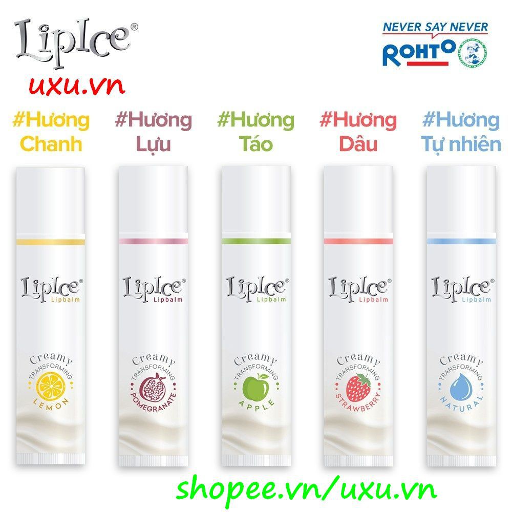 Thông tin sản phẩm: Thương hiệu: Lipice. Sản xuất tại: Việt Nam. Trọng lượng: 4.3g. • Son dưỡng không màu chuyển kem mịn Lipice Creamy có lớp sáp Lipocire tạo hiệu ứng chuyển ngay sang lớp kem mịn khi son vừa tiếp xúc môi, giúp dưỡng chất thẩm thấu nhanh và lưu giữ độ ẩm lâu hơn. • Hỗn hợp lipid có cấu trúc tương tự cấu trúc lipid trên bề mặt da môi giúp cải thiện và phục hồi nhanh tình trạng nứt nẻ, khô ráp. • Phức hợp dưỡng chất squalane, phytosteryl macadamiate, shea butter làm mềm môi hiệu quả và dưỡng ẩm tối ưu. • Menthyl Nicotinate tạo cảm giác vừa nóng vừa lạnh, dùng hằng ngày giúp dưỡng môi hồng hào, căng mọng. • SPF15 chống nắng giúp ngăn ngừa các dấu hiệu lão hóa môi. • Son dưỡng không màu LipIce Creamy gồm 5 hương: o Không hương (Natural) o Hương táo (Apple) o Hương chanh (Lemon) o Hương dâu (Strawberry) o Hương lựu (Pomegranate #son #duong #lipice #creamy #4.3g #khong #mau #chuyen #kem #min