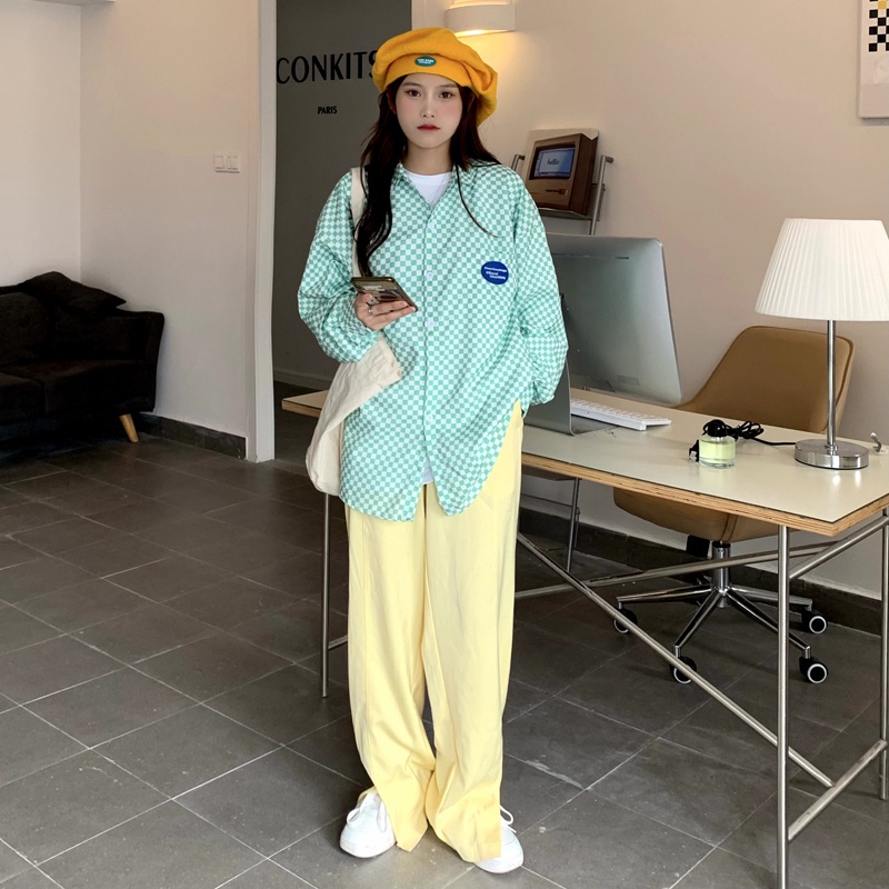 SUXI Áo sơ mi tay dài dáng rộng họa tiết sọc caro phong cách Hàn Quốc retro cá tính