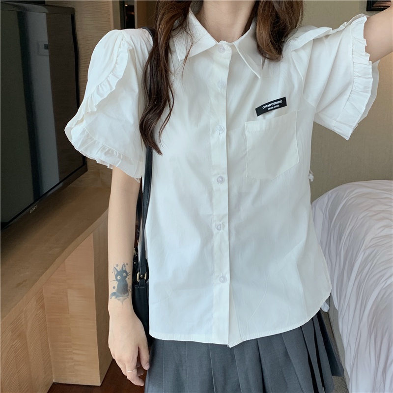 Áo sơ mi SUXI tay phồng ngắn dáng rộng màu sắc đơn giản thời trang mùa hè xinh xắn cho nữ