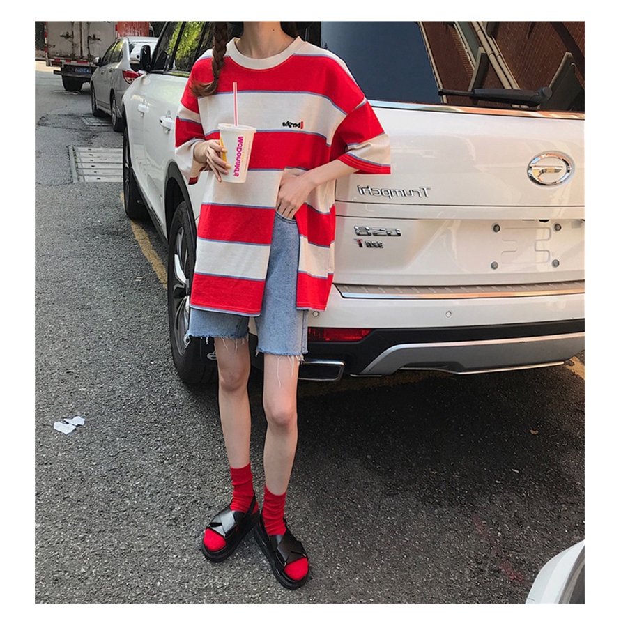 SUXI Áo Thun Nữ Tay Ngắn Kẻ Sọc Thời Trang Hàn Quốc