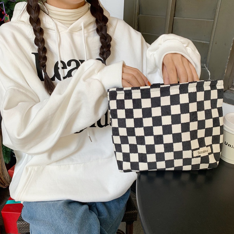 Túi Đựng Đồ Trang Điểm Họa Tiết Sọc Caro Phong Cách Hàn Quốc
