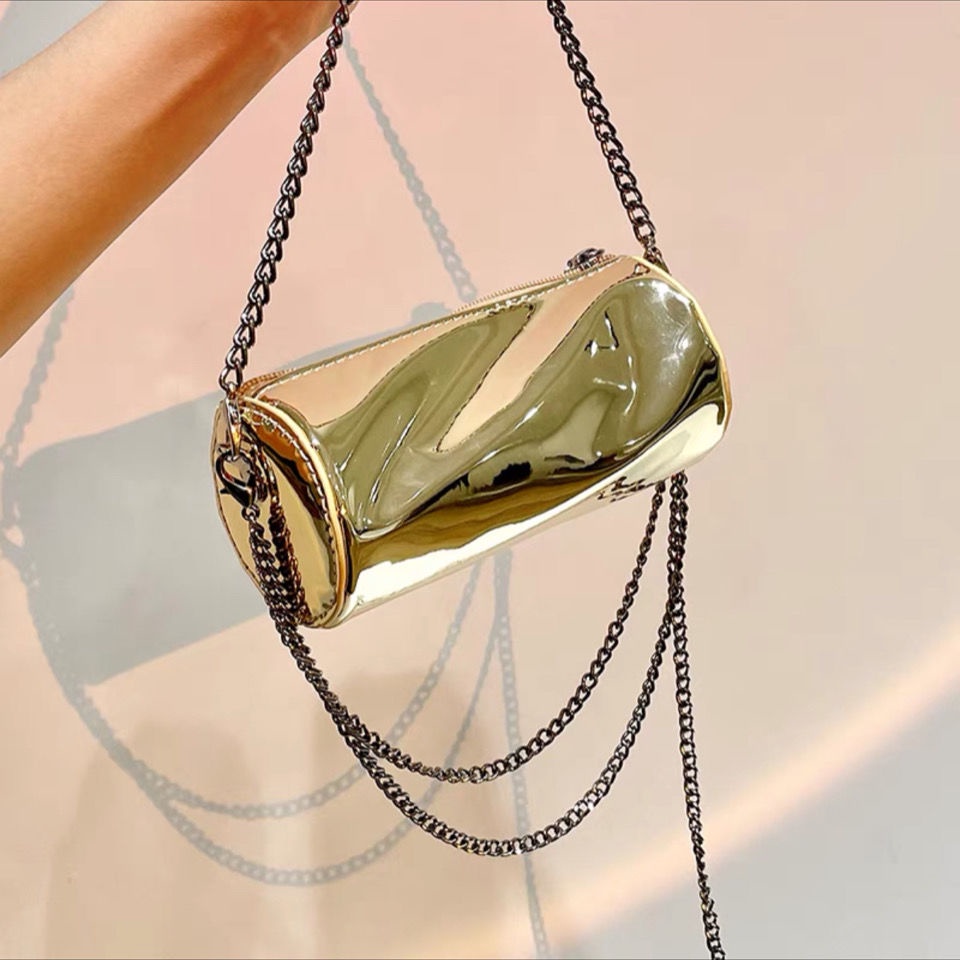 Túi Đeo Chéo Hình Trụ Mini Màu Bạc Phối Dây Xích Thiết Kế 2 Kiểu Tùy Chọn