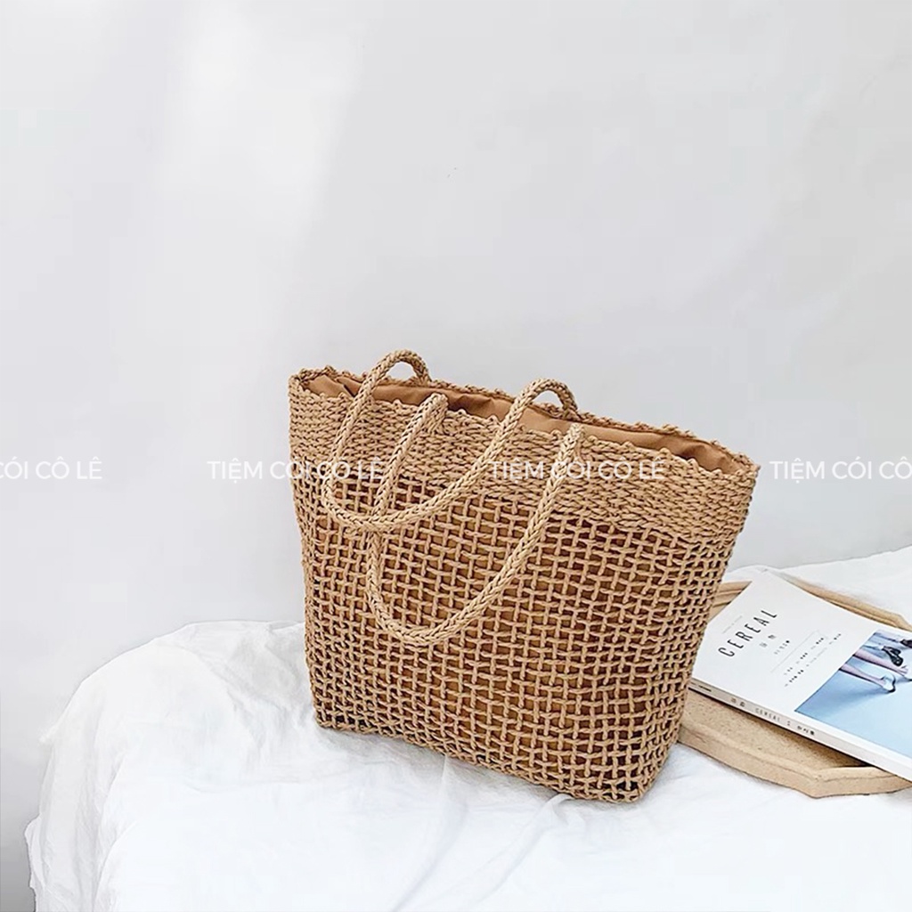 Túi cói đi biển kiểu đan lưới thưa có lót vải trong phong cách Hàn Quốc - Tiệm Cói Cô Lê
