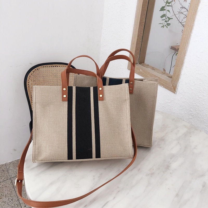 Túi cói sọc công sở đứng form có chân đế quai da đeo chéo