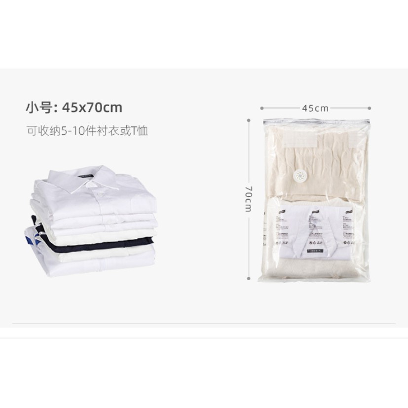 Tủ đồ đông hè nhà bạn quá bừa bộn. Chăn , ga , gối không cần dùng đến chiếm quá nhiều diện tích. 🌈 Túi hút chân không quần áo, chăn màn sẽ giúp bạn giải quyết nhanh vấn đề CAM KẾT : ➖ Sử dụng nhanh gọn, đơn giản chỉ mất khoảng 8 giây cho 1 lần ép túi (ép hoàn toàn bằng tay tiện dụng hơn các loại túi phải dùng bơm hiện nay, ngoài ra nếu bạn có máy hút bụi có thể sử dụng để hút) ➖ Giúp bảo vệ, kháng khuẩn , chống ẩm mốc ➖ Chất liệu chắc chắn , đảm bảo giữ quần áo bền đẹp dài lâu. MÁCH MẸO: Khi để vuông góc như hình sẽ giúp chứa được nhiều đồ hơn và quần áo ... không bị nhăn .🌀🌀 => Đơn giản chỉ cần kéo khoá ZIP và nhấn xuống từ từ. ✔️✔️✔️ CAM KẾT KHÔNG XÌ HƠI. CÓ THỂ TÁI SỬ DỤNG NHIỀU LẦN ✔️✔️✔️ ------------------------- 🌟 5 SIZE TÚI CỦA SHOP 🌟 #1 túi Size S: phù hợp cho đồ lót, đồ trẻ em (nén từ 10-20 bộ) hoặc các loại áo phông, quần, len mỏng, váy người lớn (4-8 áo) ➡️ #1 túi S - 45x70cm: từ 5 áo phông hoặc 2 - 3 quần áo nhẹ. ( 35k) ➡️ #1 túi M - 56x80cm: từ (6-10 áo) len , lông, quần bò hoặc (2-5 áo) dạ, phao.(45k) ➡️ #1 túi L - 50x70x30cm: loại có đáy từ (15-25 áo) phông, váy , quần bò, dạ, da. (60k) ➡️ #1 túi XL - 80x100cm: cho (8-12 lõi chăn) . Hoặc (20-30 áo) thu đông, áo khoác, thích hợp cho các loại chăn, ga lớn. (65K) ➡️ #1 túi XXL - 80x100x38cm: có đáy tăng gấp x3 lần khả năng nén đồ. Phù hợp cất tất cả đồ vào hè, đông giải phóng tủ quần áo cực tiện lợi (khả năng nén tới 12-15 lõi chăn bông to).(85k)