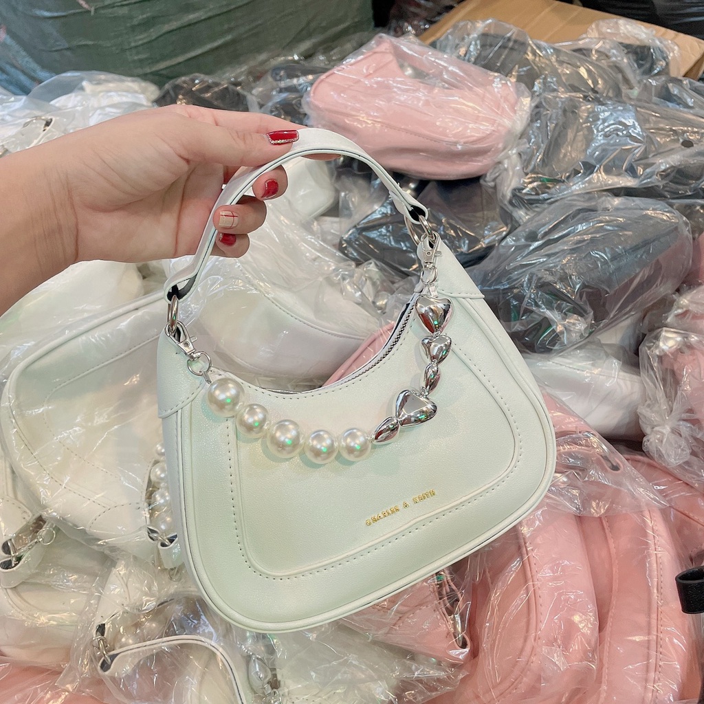 Túi xách đeo vai mini da lỳ, quai xích trái tim mix ngọc phong cách retro độc lạ, cá tính cho nữ