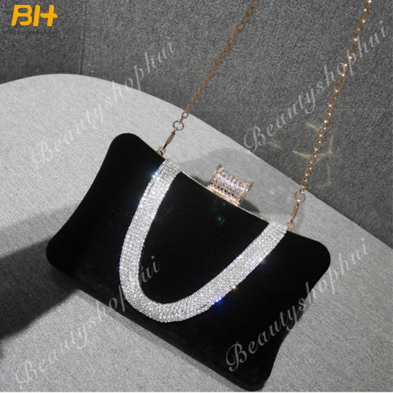 Túi xách nhung màu đen đính đá kim cương giả lấp lánh thời trang cho nữ