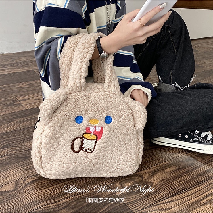 Túi xách phối lông cỡ lớn hoạ tiết gấu uống trà sữa thời trang lolita xinh xắn dành cho phái nữ