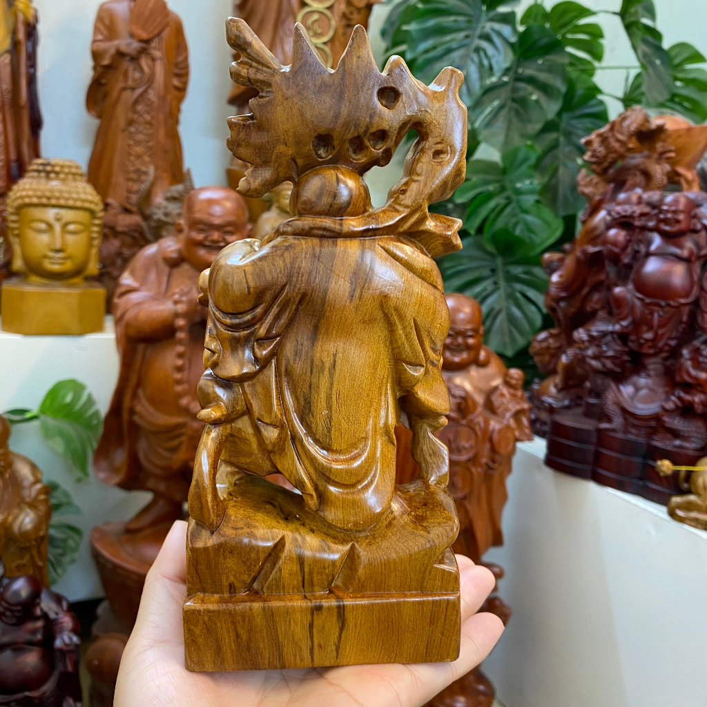 Tượng Di Lạc vác đào ngự cá chép cao 20 gỗ bách xanh thơm