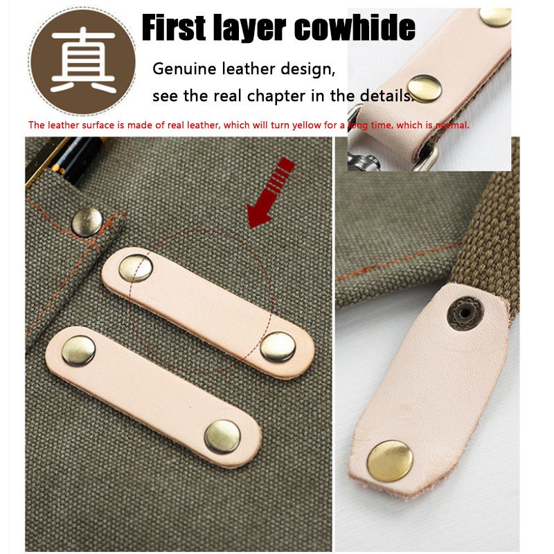 Chất liệu tạp dề: Da bò lớp + Phần cứng chống gỉ chất lượng cao + Vải dày có thể giặt được Ưu điểm của tạp dề: 1. Chất liệu vải dày dặn, giặt sạch không phai màu, co rút hay biến dạng, mang đến cho bạn trải nghiệm sâu sắc và thoải mái. 2. Chất vải