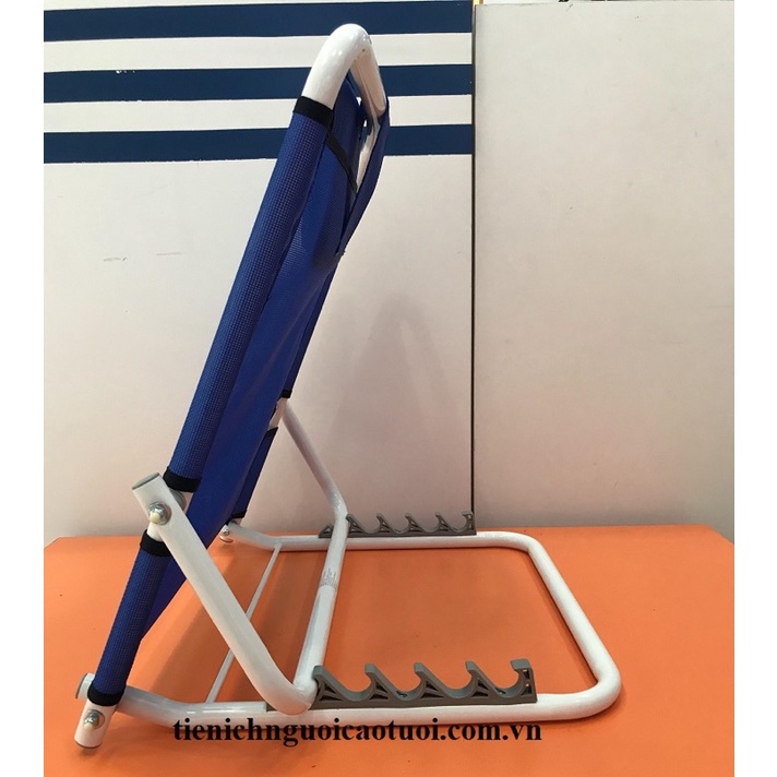 Chất liệu: - Khung sắt sơn tỉnh điện - Vải lưới nhập khẩu - thoáng mát, dễ lau chùi – vệ sinh. Ưu điểm nổi bật: - Dễ dàng điều chỉnh ở các góc độ khác nhau với nhiều nấc điều chỉnh từ 0 à 75 độ - Có thể được sử dụng với giường và ghế. - Dùng để trên giường, ghế hoặc sàn nhà. Phù hợp để chăm sóc người bệnh, người già yếu trong việc ăn – uống nghỉ ngơi hoặc nằm thư giản - Sử dụng để giữ cho các bệnh nhân cao tuổi hoặc bất động ở tư thế ngồi trên giường hoặc trên sàn. - Có gối tựa đầu, có thể nâng hạ lên xuống hoặc tháo rời khi không dùng - Trọng lượng nhẹ và có thể xếp gọn dễ dàng. - Tiện dụng để mang đi khắp nơi.