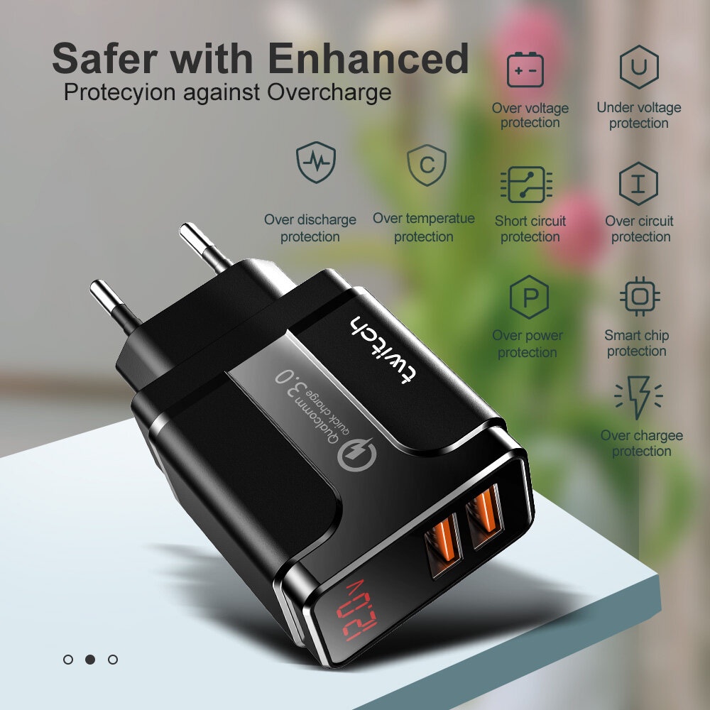Tẩu Sạc Nhanh 18W Hai Cổng USB QC 3.0 Hiển Thị LED Kỹ Thuật Số Gắn Tường