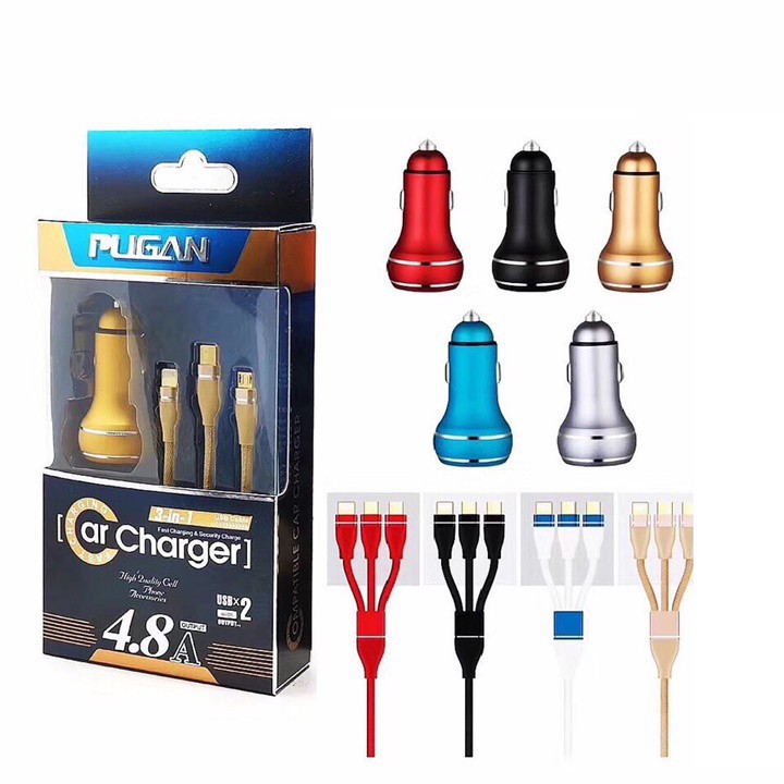 Tẩu sạc nhanh PUGAN kèm dây sạc 3 đầu- tẩu sạc xe ô tô nhỏ gọn tiện lợi
