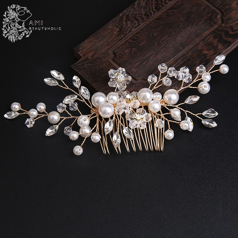 T01_Hoa Cài Tóc Cô Dâu Đính Đá và Hạt Trai, Trang Điểm Cô Dâu, Make Up Tiệc, Phụ Kiện Cưới và Trang Điểm