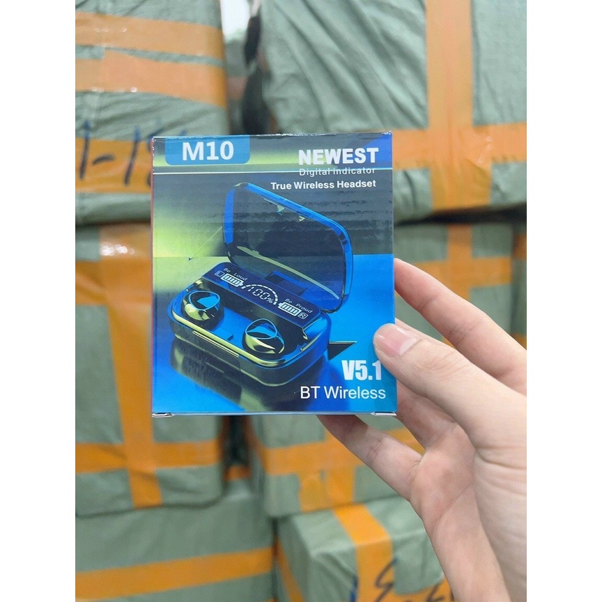 Tai nghe bluetooth M10 thiết kế đẹp mắt, âm thanh đỉnh cao, cảm biến vân tay kiêm sạc dự phòng 2500mAh Tai nghe bluetooth phiên bản: V5.1 Thời gian nghe nhạc : khoảng 4-6h Thời gian đàm thoại: khoảng 8h Thời gian chờ: 72 Tiếng Thời gian Sạc: ~ 70 phút Thời gian sạc ch