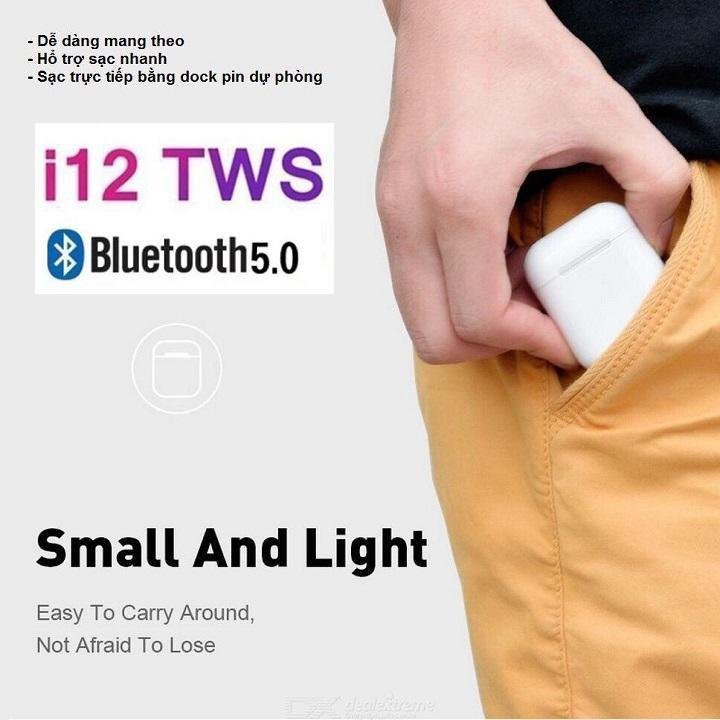 Tai Nghe Bluetooth Chính Hãng I12 Không Dây Nhét Tai Phụ Kiện Tai Nghe Điện Thoại IOS Và Android ✅ Shop là Công ty chuyên nhập khẩu phụ kiện điện thoại và các loại tai nghe chất lượng hàng đầu thị trường. ✅ Uy tín đã được đảm bảo qua hàng nghìn đơn hàng trên toàn quốc ✅ Sản phẩm được kiểm tra nghiêm ngặt nhiều lần trước khi đưa đến tay khách hàng. ✅ Khi mua sản phẩm của Shop, các bạn kiểm tra nếu có bất kỳ lỗi gì từ phía nhà sản xuất, chúng tôi cam kết đổi sản phẩm mới hoặc hoàn tiền cho các bạn. 👉 Đặc điểm: ✅ Điều khiển cảm ứng, không có nút bấm trên tai nghe ✅ Chất liệu cao cấp ✅ Âm thanh chất lượng cao ✅ Chip thông minh 5.0 ----------------------------------------------------------------------------------------------------- 👉Đặc điểm: - Khối lượng sản phẩm: 4-5g (mỗi tai nghe). - Thời gian hoạt động: 1.5-3 tiếng. - Thời gian ở trạng thái chờ: 100 tiếng cho một tai và 60 tiếng cho cả hai tai. -Thời gian sạc: 1-1.5 tiếng. - Dung lượng pin của mỗi tai nghe: 35mAh. - Dung lượng pin của hộp sạc: 300mAh. - Phạm vi kết nối không dây: 10m. ------------------------------------------------------------------------------------------------------------- 👉Gói hàng bao gồm: 2 x Tai nghe Bluetooth mini (tai nghe trái và phải) 1 x Hộp sạc 1 x Cáp sạc USB 1 x Hướng dẫn sử dụng -------------------------------------------------------------------------------------------------------------- 👉Hướng dẫn sử dụng: 1. Nhấn vào công tắc nguồn của hộp sạc 2. Mở hộp sạc và tháo tai nghe, sau đó bật nguồn tự động và ghép nối tai nghe 3. Bật tính năng Bluetooth trên thiết bị của bạn 4. Tìm kiếm inpods 12 và kết nối với inpods 12 Tai Nghe Bluetooth Chính Hãng I12 Không Dây Nhét Tai Phụ Kiện Tai Nghe Điện Thoại IOS Và Android Siêu Hay PVY-28 📣📣📣những lưu ý khi mua sắm📣📣📣 💝Chúng tôi sẽ gửi hàng trong vòng 2 ngày (trừ các ngày Lễ, Tết và những ngày đơn vị vận chuyển không làm việc) 💝Nếu có thắc mắc, vui lòng nhắn tin riêng, chúng tôi sẽ trả lời ngay khi nhìn thấy