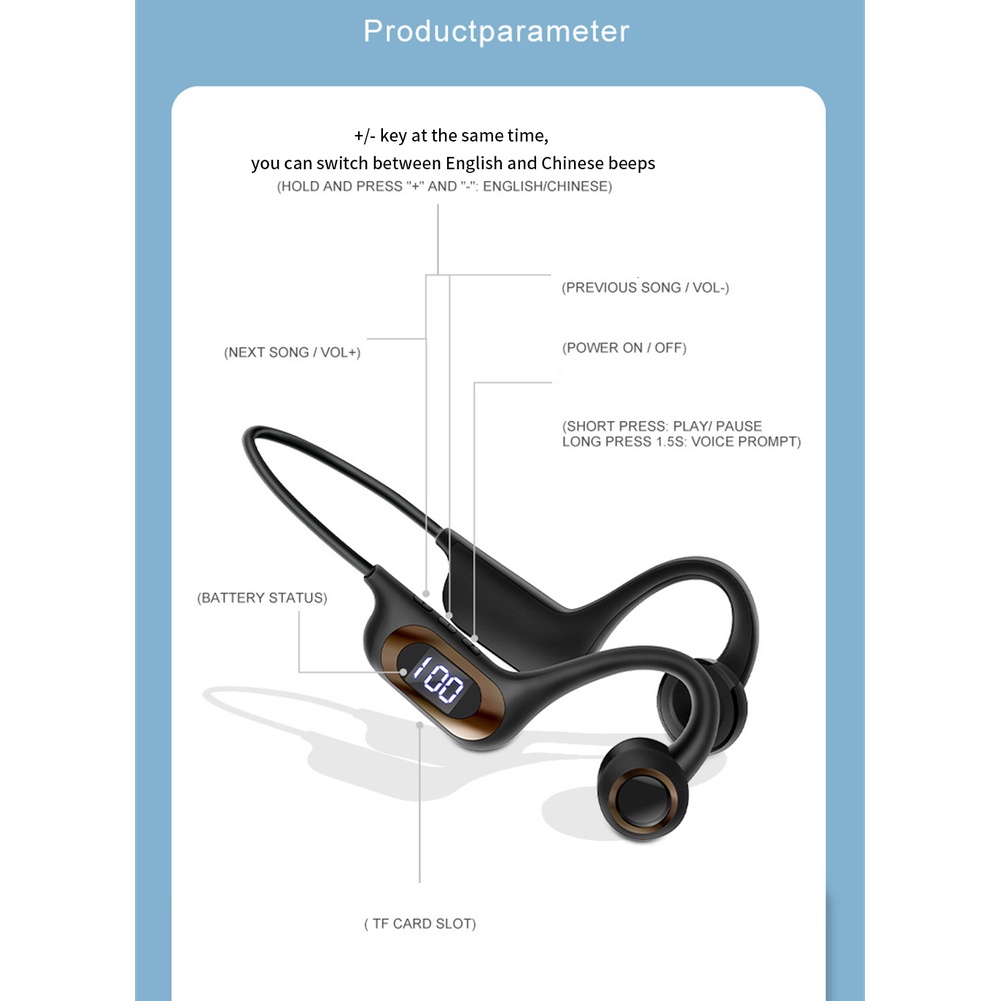 Mô tả: Số mô hình mặt hàng: AKZ-G3 Loại loa: loa dẫn xương Phiên bản Bluetooth: V5.3 Dung lượng pin: 300mAh Thời gian chơi: 30h Thời gian chờ: 100h Khoảng cách truyền: 10m Thời gian sạc: 2h Hỗ trợ: HFP / A2DP / HSP / AVRCP Thông tin chi tiết: 1. Bluetooth 5.3, ổn định và mượt mà hơn 2. Uốn theo ý muốn, thuận tiện hơn khi mang theo 3. Âm thanh nổi HIFI 4. Hỗ trợ thẻ nhớ chèn (không bao gồm thẻ nhớ) 5. Màn hình kỹ thuật số nguồn LED 6. Không phải thiết kế trong tai, thoải mái hơn khi đeo Gói hàng bao gồm: 1 x Tai nghe không dây 1 x cáp sạc