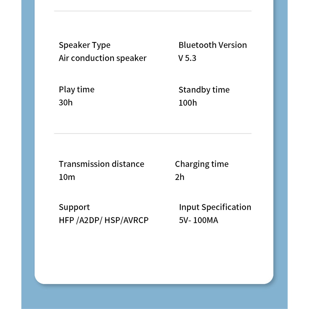 Mô tả: Số mô hình mặt hàng: AKZ-G3 Loại loa: loa dẫn xương Phiên bản Bluetooth: V5.3 Dung lượng pin: 300mAh Thời gian chơi: 30h Thời gian chờ: 100h Khoảng cách truyền: 10m Thời gian sạc: 2h Hỗ trợ: HFP / A2DP / HSP / AVRCP Thông tin chi tiết: 1. Bluetooth 5.3, ổn định
