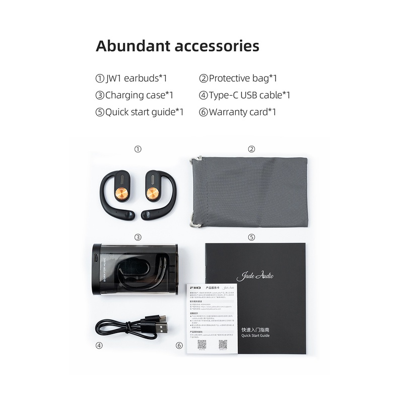 Các tính năng: - > Mở Tai nghe Bluetooth không dây đích thực. > Thiết kế không nhét trong tai. > Tính linh hoạt toàn diện. > Kết nối Bluetooth V5.3 mới nhất. > Thiết kế chống nước và mồ hôi. > Hiệu suất âm thanh mạnh mẽ với trình điều khiển động lớn 14,2mm. > Điều khiển cảm ứng dễ dàng truy cập. > Hai tùy chọn màu sắc. > Tuổi thọ pin đáng kinh ngạc. > Thích hợp cho các hoạt động thể thao, sử dụng thông thường hàng ngày. > Hai tùy chọn màu sắc. > Codec được hỗ trợ: SBC / AAC. Giới thiệu FiiO Jade Audio JW1 hoàn toàn mới, tai nghe Bluetooth không dây thiết kế mở, không trong tai. Được thiết kế đặc biệt với thiết kế móc tai giúp cân bằng khéo léo các lực xung quanh tai tại nhiều điểm và mang lại cảm giác vừa vặn thoải mái. Jade Audio JW1 thích hợp cho các môn thể thao cường độ cao vì cặp đôi này đảm bảo vừa vặn thoải mái và giúp bạn nhận biết được môi trường xung quanh. Fiio Jade Audio JW1 có trình điều khiển động lớn 14,2mm tạo ra âm thanh mạnh mẽ với âm trầm mạnh mẽ, âm trung rõ ràng và âm bổng mượt mà, đẹp mắt. Jade Audio JW1 phù hợp với các tình huống khác nhau, bạn có thể sử dụng nó ngoài trời hoặc khi đang làm việc hoặc thậm chí khi tập luyện. Nó có thiết kế chống thấm nước và chống thấm mồ hôi!! Nâng cao quá trình tập luyện của bạn hoặc đơn giản là thưởng thức âm nhạc trong khi bạn làm việc với FiiO Jade Audio JW1. Công thái học & Thoải mái: - Bạn cảm thấy mệt mỏi khi sử dụng màn hình in-ear?? Fiio Jade Audio JW1 là một thứ gì đó đặc biệt với thiết kế không trong tai. Jw1 nằm thoải mái ở bên ngoài tai của bạn với thiết kế dễ dàng đeo quanh tai. Jw1 hoàn toàn ổn định tại vị trí của nó ngay cả khi bạn vận động thể chất như chạy, tập luyện, thể thao cường độ cao, v.v. Kết nối Bluetooth V5.3 tốc độ cao: - Tai nghe không dây Jade Audio JW1 hỗ trợ kết nối Bluetooth V5.3 không dây. Bluetooth V5.3 có nghĩa là kết nối nhanh hơn và ổn định hơn, kết nối không có độ trễ với thiết bị nguồn. Điều này cung cấp khả năng truyền âm thanh mượt mà hơn, giúp JW1 phù hợp với các tình huống khác nhau như chơi game, xem phim và âm nhạc. Hiệu suất âm thanh chất lượng cao: - Fiio Jade Audio JW1 sở hữu bộ trình điều khiển động 14,2mm mới được phát triển. Nó tạo ra âm thanh trong trẻo với phản hồi âm trầm mạnh mẽ và âm trường lớn. Với tín hiệu đầu ra rõ ràng đáng yêu, hiệu suất thu được là bổ sung cho các thể loại khác nhau. Pin lâu dài: - Jade Audio JW1 cung cấp thời lượng pin lên đến 6 giờ với tai nghe mỗi lần sạc. Với hộp sạc, chúng có thời lượng pin lên đến 18 giờ. Đừng lo lắng về việc hết pin, thưởng thức âm nhạc hay khi bạn tập thể dục hoặc chỉ thư giãn.