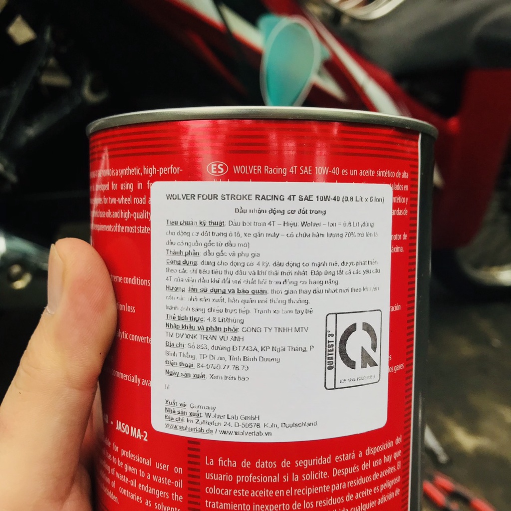 Thùng nhớt Wolver Racing 4T 10W-40 6 lon tổng hợp cao cấp nhập khẩu Đức dành cho xe máy số và xe côn tay Nhớt Wolver Racing 4T 10W40 công nghệ tổng hợp dành cho xe số xe côn tay nhập khẩu Đức, API SL,Jaso MA2 - Nhớt Wolver Racing 4T tổng hợp 10W40 ứng dụng công nghệ tổng hợp hoàn hảo được nhập khẩu từ Đức, với công thức pha chế phụ gia đủ tiêu chuẩn, có thể đáp ứng các yêu cầu kỹ thuật của những thế hệ động cơ đời mới nhất, với tính năng bảo vệ chống mài mòn, chống giảm áp suất dầu và hiện tượng oxy hóa ở nhiệt độ cao. - Thông số kỹ thuật: + Tiêu chuẩn: JASO MA2 + Độ nhớt: 10W40 + Dung tích: 800ml, 1 lít + Xuất xứ: Nhập khẩu Đức HOÀNG MOTOR CARE 🏠Ngọc Lũ, Bình Lục, Hà Nam 📲0898748262 📍SHOPEE: Hoangthuy0903 https://shopee.vn/hoangthuy09032311 ✈️✈️✈️SHIP MỌI NƠI ✈️✈️✈️ THANKS ALL ♥️♥️♥️♥️♥️♥️♥️♥️♥️ #xecontay #nhớtcaocap #nhottonghop #nhotxado #xado #daunhot #vogia #racing #winner #exciter #sonic #raider #satria #nhotxemay #nhotcaocap #nhotnhapkhau #xado #xadoracing #nhotxadoracing #repsol #repsolracing #repsolracing10w40 #10w40 #nhotrepsol #nhotrepsolracing #nhotrepsolracing10w40 #nhotnhapkhau #daunhot #wolver #wolverracing #daunhot #wolver #wolverracing