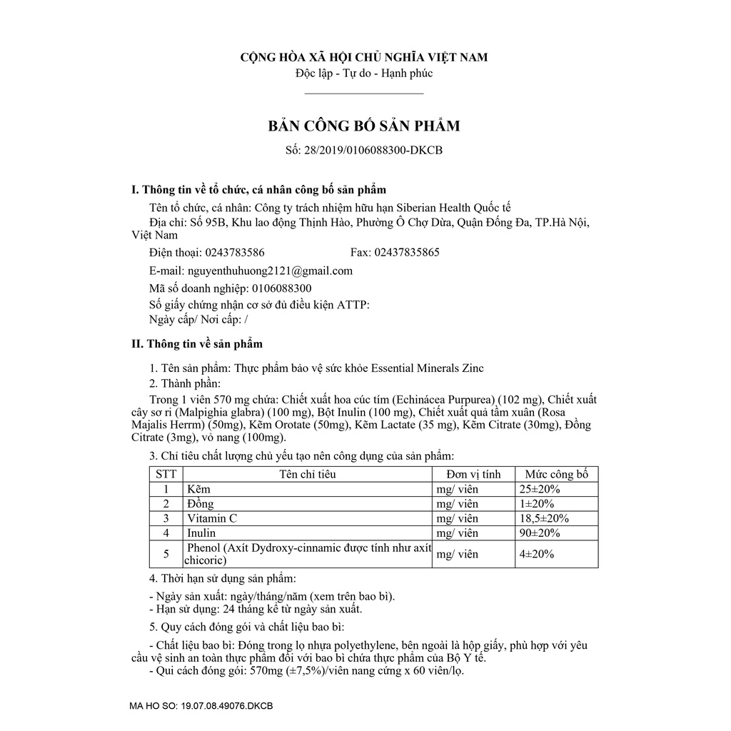 Thực phẩm bảo vệ sức khỏe Essential Minerals Zinc Siberian – 60 viên/lọ Sản phẩm là nguồn cung cấp các khoáng chất như kẽm, đồng, cùng với inulin và chiết xuất thảo dược Siberia, hỗ trợ chống ô xy hóa, hỗ trợ tăng cường sức đề kháng và giúp cải thiện sức khỏe. Thành phần: Trong 1 viên 570 mg chứa: Chiết xuất hoa cúc tím (Echinácea Purpurea) (102 mg), Chiết xuất cây sơ ri (Malpighia glabra) (100 mg), Bột Inulin (100 mg), Chiết xuất quả tầm xuân (Rosa Majalis Herrm) (50mg), Kẽm Orotate (50mg), Kẽm Lactate (35 mg), Kẽm Citrate (30mg), Đồng Citrate (3mg), vỏ nang (100mg). Công dụng: Sản phẩm là nguồn cung cấp các khoáng chất như kẽm, đồng, cùng với inulin và chiết xuất thảo dược Siberia, hỗ trợ chống ô xy hóa, hỗ trợ tăng cường sức đề kháng và giúp cải thiện sức khỏe. Bảo quản: Nơi khô ráo, tránh ánh sáng, nhiệt độ không quá 25°C, tránh xa tầm tay trẻ em. Cách dùng: Hướng dẫn sử dụng: Người lớn dùng 1 viên mỗi ngày cùng với thức ăn. Sử dụng trong vòng 1 tháng, trường hợp cần thiết có thể sử dụng lại. Đối tượng sử dụng: Người trưởng thành cần tăng cường sức đề kháng và hỗ trợ chống ô xy hóa. Xuất xứ: Liên Bang Nga Thương nhân nhập khẩu và chịu trách nhiệm về chất lượng sản phẩm: CÔNG TY TNHH SIBERIAN HEALTH QUỐC TẾ Địa chỉ: Tầng 2, tòa nhà HH-N01 Gold Season, 47 Nguyễn Tuân, Phường Thanh Xuân Trung, Quận Thanh Xuân, Thành phố Hà Nội, Việt Nam. Điện thoại: 024.3783.6033 Sản phẩm này không phải là thuốc và không có tác dụng thay thế thuốc chữa bệnh HÃY INBOX NGAY CHO CHÚNG TÔI ĐỂ SỞ HỮU SẢN PHẨM CHĂM SÓC SỨC KHỎE TỐT , DÀNH TẶNG NHỮNG NGƯỜI THÂN YÊU CỦA MÌNH NHÉ ! QUYỀN LỢI CỦA KHÁCH HÀNG khi mua hàng chính hãng tại Shop KHỎE&ĐẸP HẠNH PHÚC • Bảo hành trọn đời chất lượng sản phẩm, hỗ trợ đổi trả miễn phí trong 7 ngày (theo chính sách của sàn TMĐT) • Chất lượng sản phẩm được kiểm định kĩ lưỡng trước khi gửi cho Quý khách • Tư vấn hỗ trợ 24/24 giải đáp mọi thắc mắc khi khách hàng gọi vào số hotline hoặc nhắn tin cho Shop • Ấn FOLLOW shop để nhận nhiều ưu đãi ☎ Tư Vấn : 0904.115.239. Shop cam kết : 1. 100% sản phẩm chính hãng 2. Giao COD toàn quốc. 3. Đổi trả theo quy định của sàn TMĐT. #kẽm #kem #zincblackmore #zinc_blackmore #zinc #zincplex #zinc_plex #zincforacne #zinc_for_acne #zinctheordinary #zinc_the_ordinary #siberian #zinc1 #zinc_1 #kẽmzinc #kẽm_zinc #kemzinc #kem_zinc #siberi #siberica #kẽmchobé #kẽm_cho_bé #kemchobe #kem_cho_be #siberianwellness #siberian_wellness #kẽmbioisland #kẽm_bioisland #kembioisland #kem_bioisland #zinc50mg #zinc_50mg #kẽmlàmhoa #kẽm_làm_hoa #kemlamhoa #kem_lam_hoa #kẽmbiocare #kẽm_biocare #kembiocare #kem_biocare #kẽmhàncellpin #kẽm_hàn_cell_pin #kemhancellpin #kem_han_cell_pin #kẽmdhc #kẽm_dhc #kemdhc #kem_dhc #kẽmhàn #kẽm_hàn #kemhan #kem_han #zincdhc #zinc_dhc #zincnaturebounty #zinc_nature_bounty #kẽmdhc60ngày #kẽm_dhc_60_ngày #kemdhc60ngay #kem_dhc_60_ngay #siberiandưỡngdatay #siberian_dưỡng_da_tay #siberianduongdatay #siberian_duong_da_tay #zincnow #zinc_now