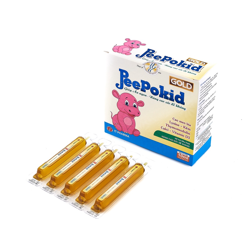 Thực phẩm bảo vệ sức khỏe Peepokid Gold chứa L-Lysine, Taurin, Cao men bia, Canxi gluconat nano, Canxi glycerophosphat, Vitamin D3, DHA, Thymomodulin, Kẽm, Vitamin PP, B1, B2, B5, hỗ trợ tiêu hóa, giúp ăn ngon, hỗ trợ nâng cao sức đề kháng giúp cơ thể khỏe mạnh. Làm