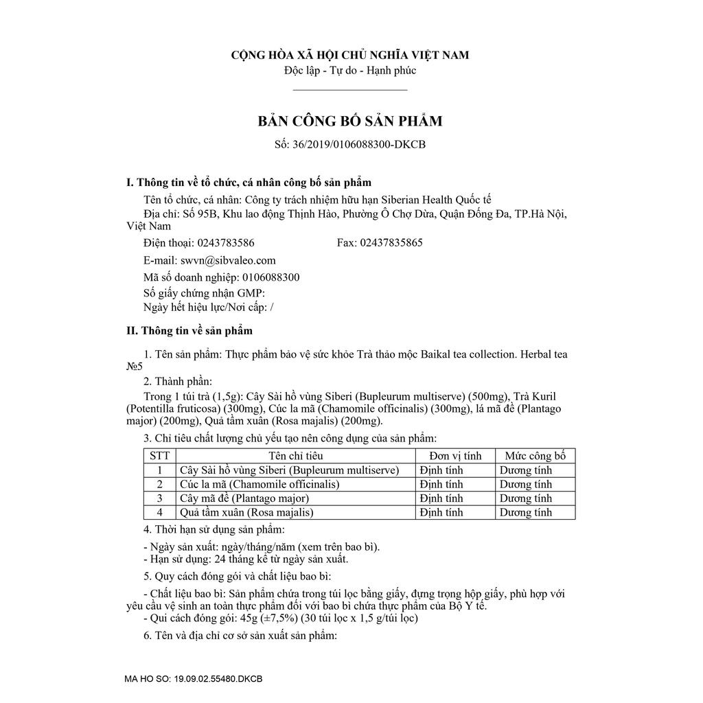 [Trà tiêu hóa N5] Thực phẩm bảo vệ sức khỏe Trà thảo mộc Baikal tea collection Herbal tea N5 - 30 túi/hộp Thành phần độc đáo của thảo dược Siberia có trong Trà thảo mộc Baikal tea collection. Herbal tea №5 như: hoa cúc La Mã, cây sài hồ, trà Kuril, lá mã đề, hỗ trợ tiêu hóa tốt cho người dùng. Thành phần: Trong 1 túi trà (1,5g): Cây Sài hồ vùng Siberi (Bupleurum multiserve) (500mg), Trà Kuril (Potentilla fruticosa) (300mg), Cúc la mã (Chamomile officinalis) (300mg), lá mã đề (Plantago major) (200mg), Quả tầm xuân (Rosa majalis) : Công dụng: Thành phần độc đáo của thảo dược Siberia có trong Trà thảo mộc Baikal tea collection. Herbal tea №5 như: hoa cúc La Mã, cây sài hồ, trà Kuril, lá mã đề, hỗ trợ tiêu hóa tốt cho người dùng. Bảo quản: khô ráo, tránh ánh sáng, nhiệt độ không quá 25ºC, tránh xa tầm tay trẻ em. Cách dùng: Hướng dẫn sử dụng: Cho 1 gói trà vào một cốc nước sôi (200ml) hãm trong 10-15 phút. Dùng 1 gói trong bữa ăn trong ngày. Đối tượng sử dụng: Người lớn. Xuất xứ: Liên Bang Nga Thương nhân nhập khẩu và chịu trách nhiệm về chất lượng sản phẩm: CÔNG TY TNHH SIBERIAN HEALTH QUỐC TẾ Địa chỉ: Tầng 2, tòa nhà HH-N01 Gold Season, 47 Nguyễn Tuân, Phường Thanh Xuân Trung, Quận Thanh Xuân, Thành phố Hà Nội, Việt Nam. Điện thoại: 024.3783.6033 Sản phẩm này không phải là thuốc và không có tác dụng thay thế thuốc chữa bệnh HÃY INBOX NGAY CHO CHÚNG TÔI ĐỂ SỞ HỮU SẢN PHẨM CHĂM SÓC SỨC KHỎE TỐT , DÀNH TẶNG NHỮNG NGƯỜI THÂN YÊU CỦA MÌNH NHÉ ! QUYỀN LỢI CỦA KHÁCH HÀNG khi mua hàng chính hãng tại Shop KHỎE&ĐẸP HẠNH PHÚC • Bảo hành trọn đời chất lượng sản phẩm, hỗ trợ đổi trả miễn phí trong 7 ngày (theo chính sách của sàn TMĐT) • Chất lượng sản phẩm được kiểm định kĩ lưỡng trước khi gửi cho Quý khách • Tư vấn hỗ trợ 24/24 giải đáp mọi thắc mắc khi khách hàng gọi vào số hotline hoặc nhắn tin cho Shop • Ấn FOLLOW shop để nhận nhiều ưu đãi ☎ Tư Vấn : 0904.115.239. Shop cam kết : 1. 100% sản phẩm chính hãng 2. Giao COD toàn quốc. 3. Đổi trả theo quy định của sàn TMĐT. #siberian #siberianwellness #siberian_wellness #siberi