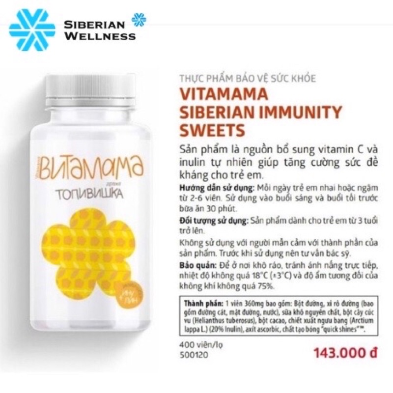 Thực phẩm bảo vệ sức khỏe VitaMama Siberian immunity sweets – 400 viên Sản phẩm là nguồn bổ sung vitamin C và inulin tự nhiên hỗ trợ tăng cường sức đề kháng cho trẻ em. THÀNH PHẦN VitaMama Siberian 1 viên 360mg bao gồm: Bột đường, xi rô đường (bao gồm đường cát, m
