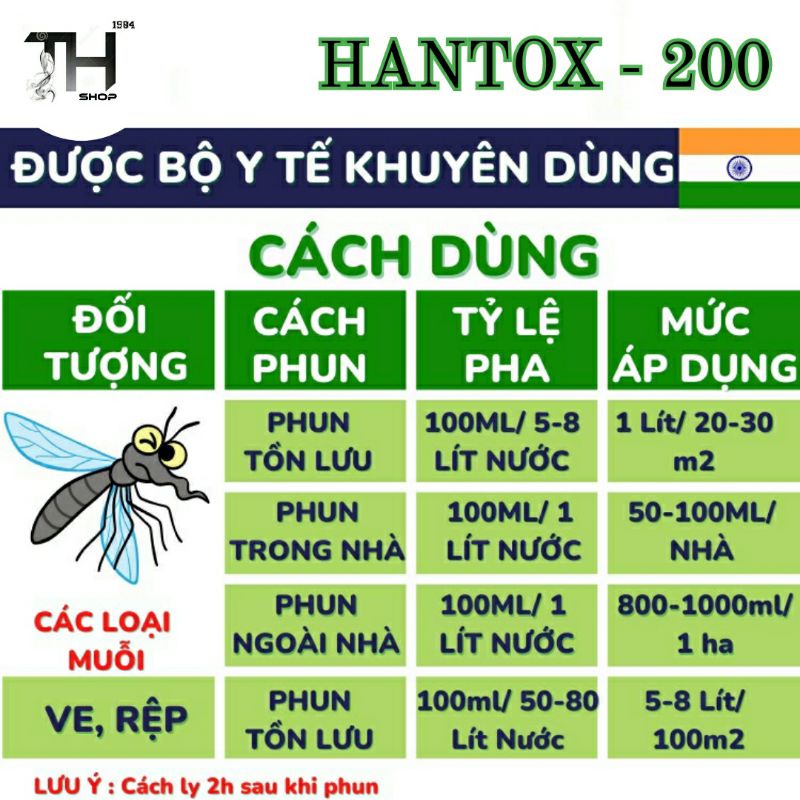 THÀNH PHẦN CHÍNH – Mỗi ml Hantox 200 chứa: Deltamethrin 20 mg – Tá dược vđ: 1 ml CÔNG DỤNG SẢN PHẨM – Cơ chế diệt côn trùng của Hantox 200: Là thông qua tiếp xúc và vị độc, thuốc có thể phun tồn lưu để diệt muỗi, ruồi, kiến, gián, bọ chét và côn trùng có cánh khác