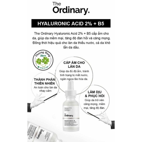 Em này sử dụng Hyaluronic Acid với nồng độ 2%. Hoạt chât này từ lâu đã nổi tiếng với công dụng dưỡng ẩm trong làng skincare, là vị cứu tinh cho làn da khô nẻ, mất nước. Hyaluronic Acid được ví như một miếng mút thần với công năng chứa nước vi diệu. Chất này có khả năng tăng trọng lượng gấp 1000 lần mỗi khi gặp nước, nhờ đó, lượng nước được giữ lại trong tế bào đủ để giúp bề mặt da luôn ẩm mịn và căng mọng. Từ đó, tạm biệt những vấn đề như khô nẻ, thiếu nước hoặc bong tróc… Cùng với đó, công thức còn kết hợp tuyệt vời với B5 – Vitamin đình đám trong việc phục hồi làn da bị tổn thương. Hoạt chất này có tác dụng làm dịu làn da bị kích ứng, cải tạo cấu trúc làn da bằng việc cung cấp chất béo và oxy cho da, để phục hồi lớp biểu bì, cho da chóng lành. Tinh chất Vitamin B5 không tan trong dầu, và rất tốt trong việc chăm sóc làn da khỏe khoắn bên trong, sáng đẹp bên ngoài. Pentylene Glycol cũng được thêm vào công thức. Thành phần này cũng thuộc nhóm cấp nước, dưỡng ẩm cho da, giúp da luôn ẩm mịn và ngăn ngừa tình trạng mất nước, Không chỉ vậy, chất này còn được sử dụng như một chất kháng khuẩn, có tác dụng bảo vệ công thức chăm sóc da. Kết hợp với Propanediol – hoạt chất cải thiện độ ẩm của da với 100% nguồn gốc tự nhiên. Ngoài ra, chất này còn là chất nhũ hóa, dung môi và có tác dụng tăng hiệu quả bảo quản của sản phẩm. Thành phần: Aqua (Water), Sodium Hyaluronate, Sodium Hyaluronate Crosspolymer, Panthenol, Ahnfeltia Concinna Extract, Glycerin, Pentylene Glycol, Propanediol, Polyacrylate Crosspolymer-6, PPG-26-Buteth-26, PEG-40 Hydrogenated Castor Oil, Trisodium Ethylenediamine Disuccinate, Citric Acid, Ethoxydiglycol, Caprylyl Glycol, Hexylene Glycol, Ethylhexylglycerin, Phenoxyethanol, Chlorphenesin. ------------------ [Tất cả sản phẩm The Ordinary mình đặt trực tiếp từ Canada/US] ĐÔI LỜI NHẮN NHỦ: Mình bán The Ordinary từ rất lâu rồi. Hãng TO thay vì đầu tư vào bao bì thì hãng tập trung nghiên cứu chất lượng sản phẩm, nên các sản phẩm TO sẽ có các đặc điểm sau: 1. HÃNG THAY ĐỔI BAO BÌ LIÊN TỤC (có khi vài lần/năm) 2. CODE IN BẰNG NHIỀU MÀU MỰC (đen, xanh, vàng). Có những lô không in code trên ruột hoặc vỏ (lỗi in ấn). 3. SẢN PHẨM KHÔNG CÓ TEM, SEAL NIÊM PHONG. 4. LƯỢNG SERUM BƠM KHÔNG ĐỀU: có chai bơm đầy, có chai bơm vơi. 5. NẮP KÊNH: "đặc trưng" nổi tiếng nhà TO chắc tớ không cần giới thiệu nhiều ^^. Tuy nhiên nhiều lọ nắp vẫn "chuẩn chỉnh" ko kênh nha. 6. THÀNH PHẦN KHÔNG GIỐNG NHAU: thị trường khác nhau và thời điểm sản xuất khác nhau thì sản phẩm có thành phần khác nhau. Hãng có ghi rõ trên web: "Our formulations are updated from time to time as part of our commitment to innovation. As such, the ingredient list shown here may vary from the box of the product depending on time and region of purchase." 7. CHẤT, MÀU, MÙI SERUM GIỮA CÁC LÔ KHÔNG ĐỒNG NHẤT: có lô đậm, nhạt, loãng, đặc do khác thành phần, hoặc ko đồng nhất giữa các lô.