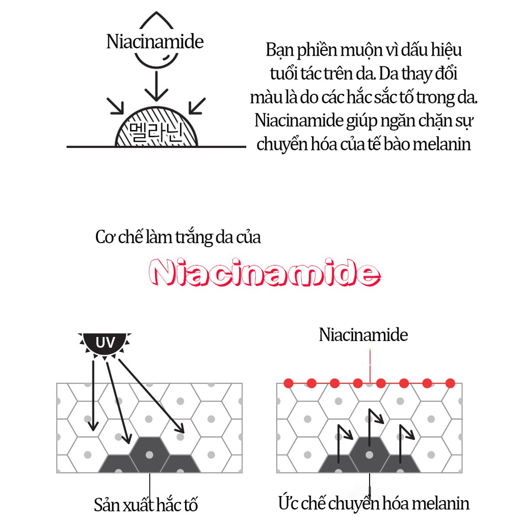 Tinh Chất Dưỡng Trắng Mịn, Cải Thiện Các Khuyết Điểm Của Da Care:nel Niacinamide 10% + Zinc 1% Serum Thương hiệu : Care:nel Xuất xứ : Hàn quốc Dung tích : 30ml - Dành cho mọi loại da - Dành cho làn da có tình trạng tuyến nhờn hoạt động quá độ - Dành cho làn da có tình trạng lỗ chân lông to, thiếu mềm mịn - Dành cho làn da thâm sạm, sỉn màu Tinh Chất Dưỡng Trắng Mịn, Cải Thiện Các Khuyết Điểm Của Da Carenel Niacinamide 10% + Zinc 1% Serum đã được đặc chế để giảm sự xuất hiện của các khuyết điểm và làm mịn vùng da sần sùi với công thức chứa nồng độ cao của Niacinamide được kết hợp với Kẽm giúp cân bằng da, cải thiện lỗ chân lông và tông da **Công dụng : - Tăng tốc độ chữa lành da và giảm khô sần da. - Giúp làm giảm một số mẩn đỏ và kích ứng liên quan đến các tình trạng mụn. - Làm chậm quá trình lão hóa da - Ngăn ngừa, cải thiện tình trạng thâm sạm, da xỉn màu - Dưỡng trắng da , se khít lỗ chân lông - Tăng khả năng đàn hồi giúp da săn chắc - Giúp da tươi trẻ - Giảm dầu nhờn trên da **Thành phần : - Chiết xuất rau má có đặc tính ngăn ngừa các gốc tự do gây hại cho da, hydrat hóa lớp sừng và hàng rào biểu bì trên bề mặt da, đồng thời giúp giảm mất nước qua biểu bì giúp duy trì làn da ẩm mịn và mềm mại. - Chiết xuất hoa cúc Arnica Montana được sử dụng để làm se da, khử trùng . Đồng thời còn giúp kích thích tuần hoàn - 1% chiết xuất kẽm là thành phần hữu ích đối với làn da dầu mụn với khả năng miễn dịch, tổng hợp protein, tổng hợp DNA , làm lành vết thương - Niacinamide cũng giúp làm giảm sự xuất hiện của lỗ chân lông và giúp phục hồi độ đàn hồi của da. - Ceramide – lớp màng bảo vệ da tự nhiên giúp duy trì độ ẩm trên da và tăng sinh collagen và elastin. Nhờ vậy, Niacinamide có khả năng ngăn chặn tình trạng lão hóa sớm ở da khá hiệu quả và ngăn chặn tình trạng da thâm sạm, sỉn màu do tác hại từ tia UV. **Hướng dẫn sử dụng: - Sau khi làm sạch da, sử dụng nước hoa hồng để cân bằng da. - Lấy một lượng vừa đủ thoa đều lên bề mặt da, massage nhẹ nhàng theo chiều kết cấu da. - Vỗ nhẹ để dưỡng chất được hấp thụ tối đa. Hạn sử dụng: 3 năm kể từ ngày sản xuất NSX xem trên bao bì