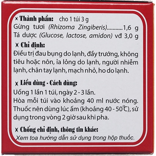 Thành phần và công dụng: Sản phẩm thành phần gồm gừng tươi và tá dược, được sản xuất theo quy trình chất lượng nghiêm ngặt cho sản phẩm an toàn với sức khỏe, không sử dụng hóa chất độc hại. Hương vị gừng đặc trưng, thơm nồng, dễ uống. Trà gừng Traphaco có công dụng trục hàn, ôn trung, hồi dương, thông mạch, chỉ định dùng khi giảm đau bụng do lạnh, đầy trướng không tiêu hoặc nôn, ỉa lỏng do lạnh, người nhiễm lạnh, chân tay lạnh, mạch nhỏ, ho do lạnh. Trà gừng được đóng thành các gói nhỏ, kín, tiện lợi khi mang theo bên mình khi đi ra ngoài, đến công ty, trường học... nhỏ tiện lợi pha chế và thưởng thức. Hướng dẫn sử dụng: Hòa mỗi túi vào 40ml nước nóng. Uống 1 lần 1 túi, ngày 2 - 3 lần.