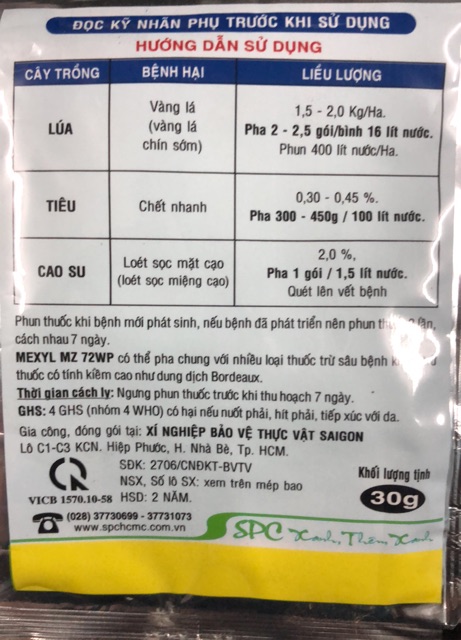 Hướng dẫn sử dụng: Tên thương mại MEXYL MZ 72WP Hoạt chất Metalaxyl 8%, Mancozeb 64%, Chất phụ gia 28% Quy cách 30gr Công dụng đặc trị các loại nấm hại cây trồng: bệnh sương mai, bệnh thối nõn, bệnh xì mủ, chết nhanh, lóet sọc miệng cạo. Hướng dẫn sử dụng Liều lượng Pha 30g bình 8 lít nước. Phun 5 bình/1000m2. Trị sương mai cho cà chua Pha 25-30g/bình 8 lít nước. Phun 5 bình/1000m2. Trị thối nõn cho Dứa(Thơm- khóm) Pha 20-30g/bình 8lít nước. Phun ướt đều lên tán lá và xung quanh gốc. Pha 30g/ 1lít nước, quét trên vết bệnh sau khi đã cạo sạch,15ngày sau quét lại lần 2. Trị sương mai cho vải và trị xì mủ cho sầu riêng Pha 25-30g/bình 8lít nước, phun ướt đều lên cây trồng và tưới xung quanh gốc. Trị chết nhanh(thối rễ) cho tiêu Pha 30g/ 1lít nước, quét lên mặt cạo, 10-15 ngày quét 1 lần. Trị loét mặt cạo(loét sọc miệng cạo) cho cao su Ngưng phun trước khi thu hoạch 7 ngày