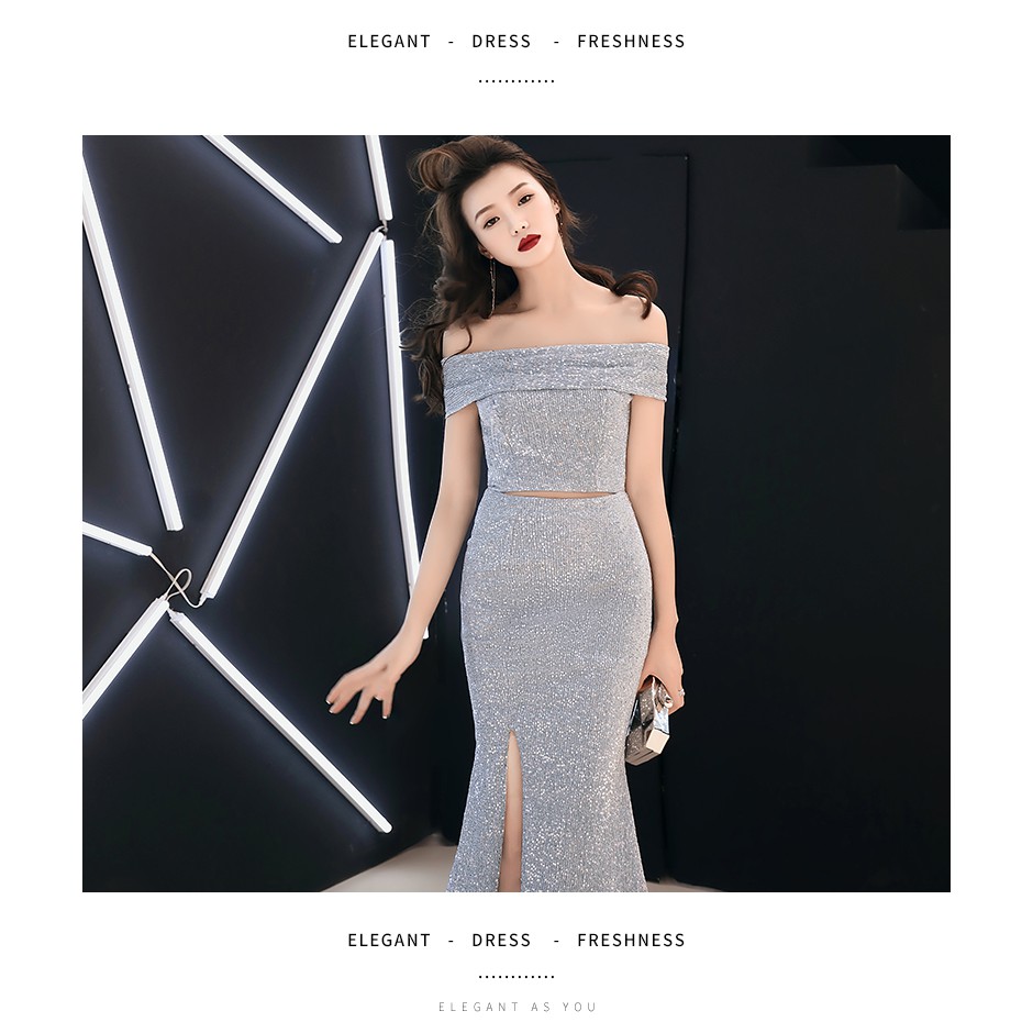 Váy Đầm Dạ Hội Trễ Vai Xẻ Tà Đuôi Cá Sang Trọng Và Gợi Cảm Màu Bạc Kim Sa
