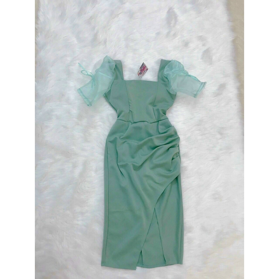 Váy đầm nữ body dự tiệc tay phồng cổ vuông đuôi váy xẻ