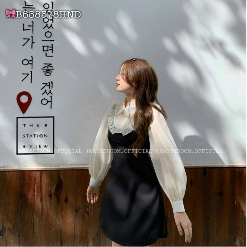 Váy/Đầm sơ mi đen phối cổ bèo tay voan dành cho nữ bành bèo-Đầm tiểu thư ulzzang đi học dạo phố dự tiệc dễ thương
