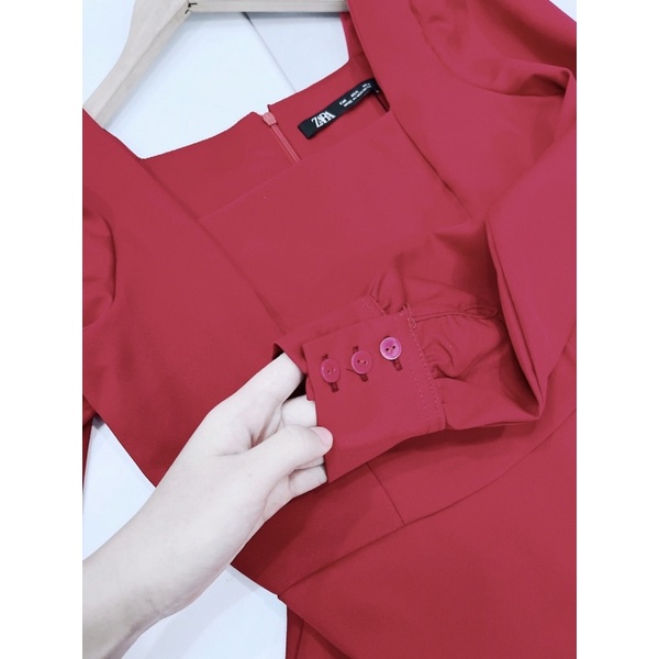 Váy đỏ cổ vuông tay bồng dài qua gối diện tết xinh